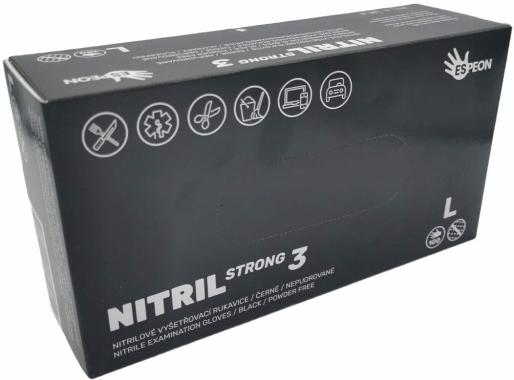 Jednorázové ochranné rukavice NITRIL STRONG jsou vyrobené ze 100% syntetického nitrilu, nesterilní, nepudrované, zesílené pro vyšší ochranu rukou při práci. Jsou texturované na koncích prstů pro lepší úchop a citlivost. Nitrilové rukavice se vyznačují nejlepší mechanickou a chemickou odolností, odolají mnoha chemikáliím, rozpouštědlům a dalším agresivním tekutinám. Jsou hypoalergenní (nezpůsobují alergické reakce). Vhodné pro styk s potravinami. Délka 240 mm, síla stěny na prstech min. 0,12 mm. AQL 1,5. Cat. III.Velikosti S, M, L a XL. Barva černá. Balení 100 kusů. Cena uvedena za balení.Doporučené použitíZdravotnictví, lékařská péče, potravinářství, kadeřnictví, automobilový a strojírenský průmysl, veškeré konstrukční a montážní práce, ve stavebnictví, mechanizaci, potravinářství, při úklidových pracích, vhodné pro elektrikáře, instalatéry, údržbáře, zámečníky a truhláře, pracovníky komunálního hospodářství, technických a provozních oddělení.Pokyny k použitíRukavice se nasazují na suché a čisté ruce. Manžetu umístěte přes oděv, abyste předešli proniknutí kapaliny či jiné používané látky. Rukavice jsou určeny převážně pro jednorázové použití. Při sundávání rukavic se nedotýkejte jejich vnější strany, přehněte konec manžety a stáhněte je otočením naruby.Pokyny ke skladováníRukavice skladujte v jejich originálním obalu, chraňte před přímým sluncem, v dostatečné vzdálenosti od zdrojů tepla.