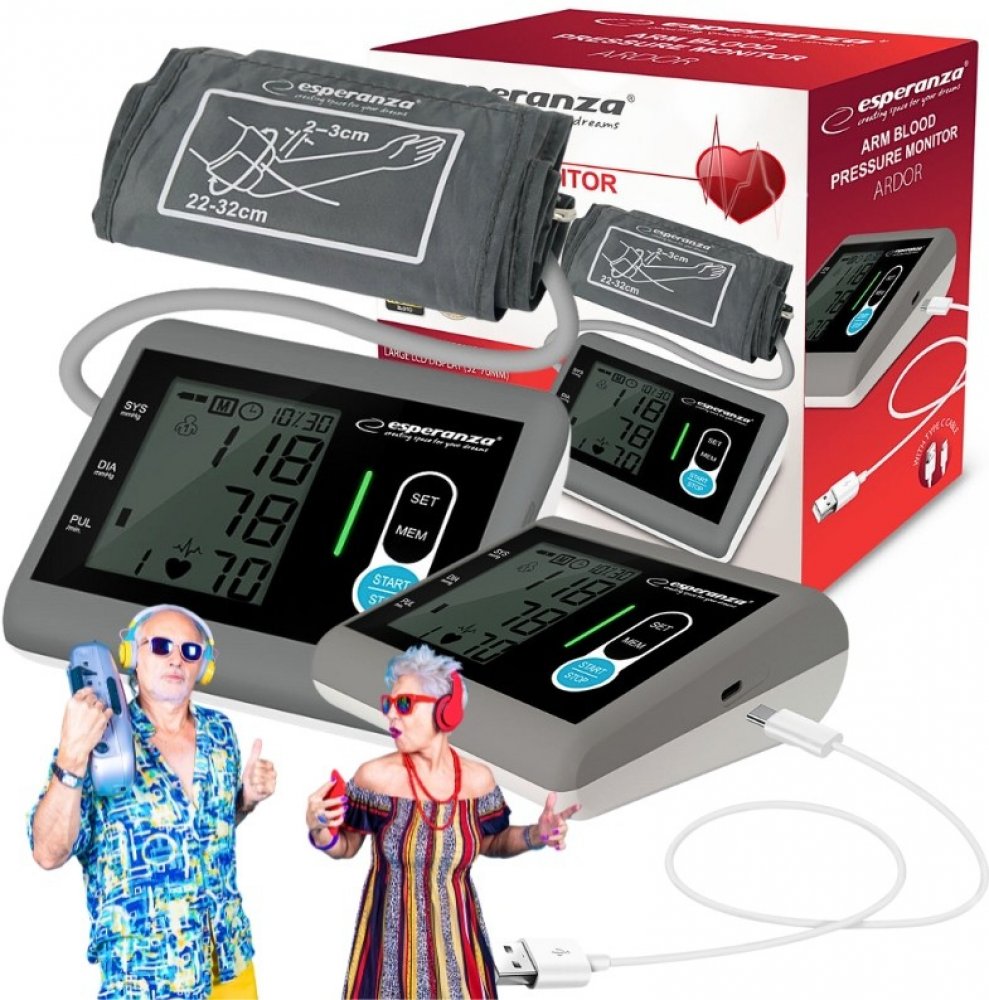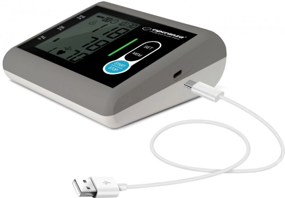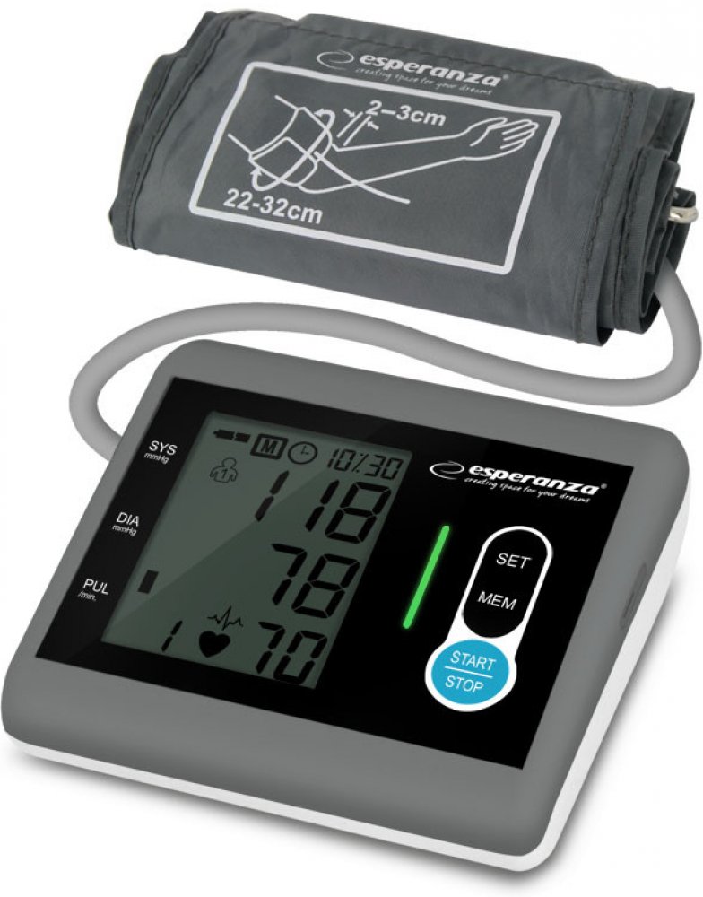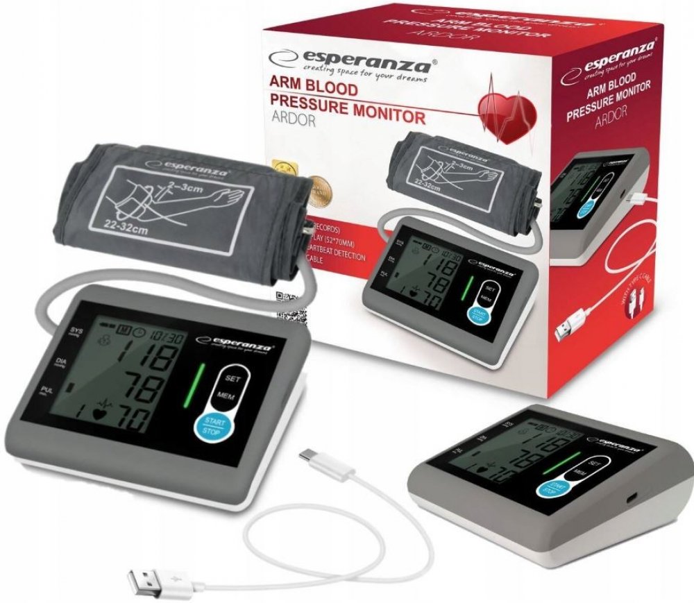 Esperanza šedá kombinované 180 měření na paži s flexibilním napájením (baterie + adaptér) pro detekci arytmií/ECG pro páry (2 profily) oscilometrické automatické 300 g 126 x 130 x 50 mm pro běžné dospělé paže pouze lokální paměť