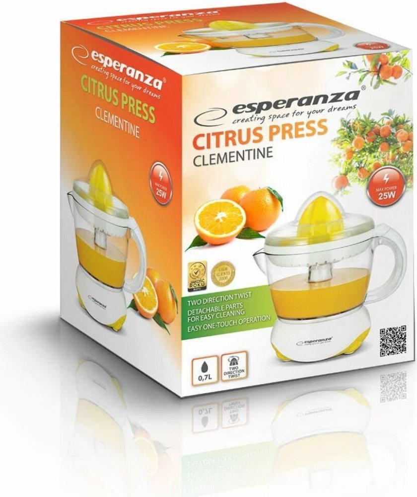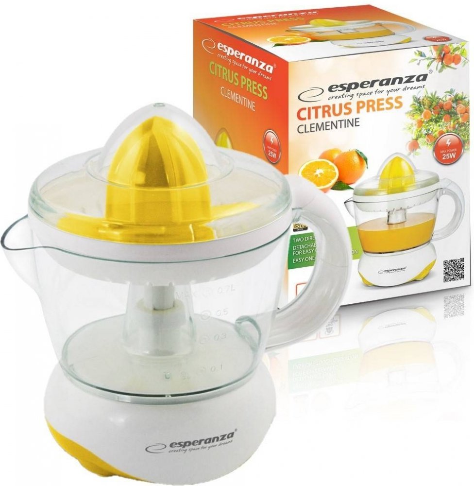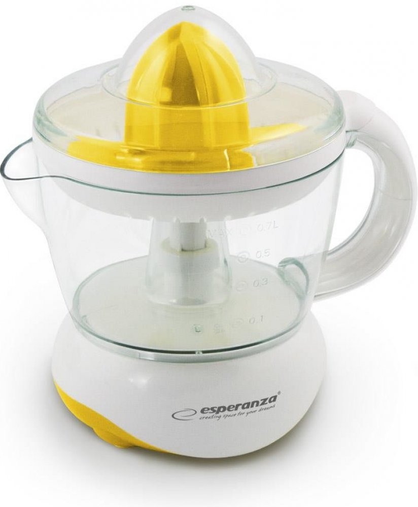 Začněte nový den porcí zdravé šťávy plné vitamínů připravené doma. S lisem Esperanza získáte čerstvou citrusovou šťávu rychle a efektivně, kdykoli budete chtít. Je vybavena univerzálním kuželem pro velké i malé citrusy. Pro lepší výkon se kužel automaticky otáčí doprava nebo doleva. Náš lis na citrusy je nezbytný v kuchyni pro lidi, kteří si váží svého zdraví i zdraví svých blízkých.
