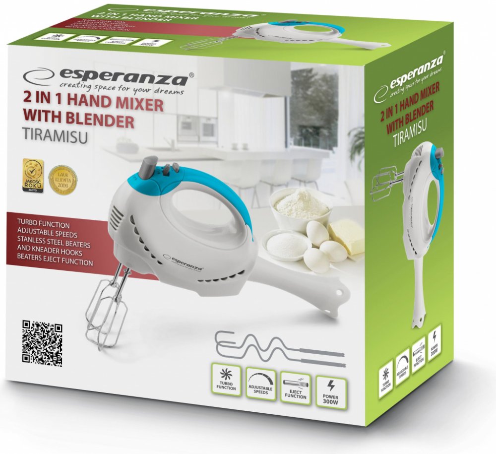 EKM010 Tiramisu ruční mixér Náš míchací a míchací stroj zajišťuje účinnost a efektivitu. Díky možnosti změny rychlosti můžete mísit / míchat libovolné ingredience a dosáhnout jejich specifikované konzistence. Díky elegantnímu vzhledu zařízení se hodí do interiéru každé kuchyně specifikace: Systém „2v1“: směšovač + mixér Ergonomická rukojeť 2 mísiče z nerezové oceli 2 metly z nerezové oceli Vestavěný mixér Spotřeba energie: 300 W Nastavitelná rychlost Funkce EJECT - zajišťuje pohodlné vyjmutí mixéru a metly Turbo funkce