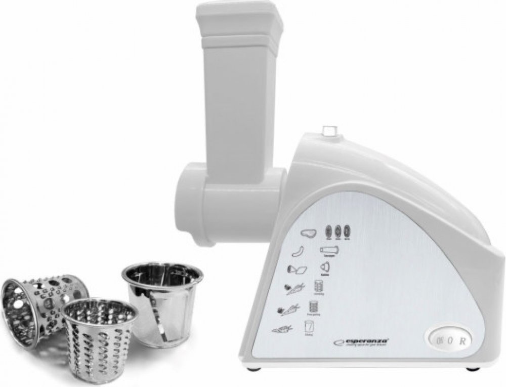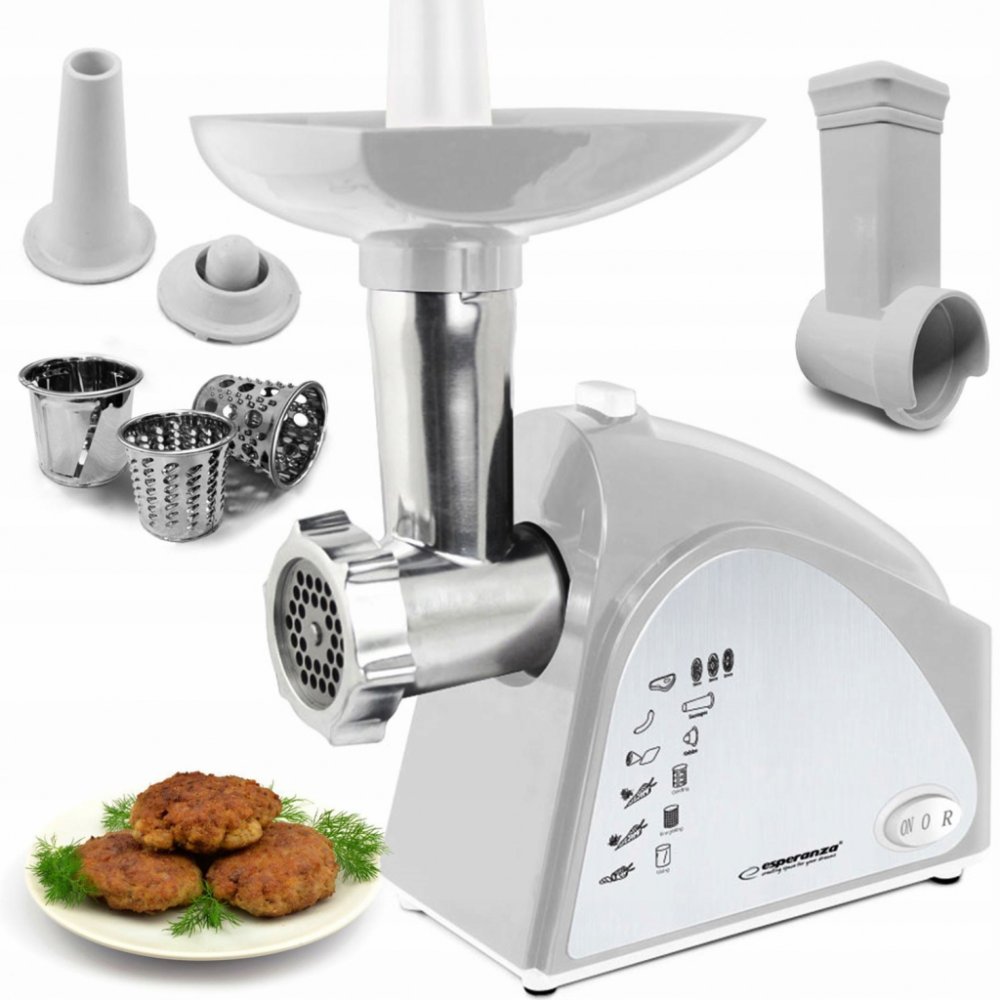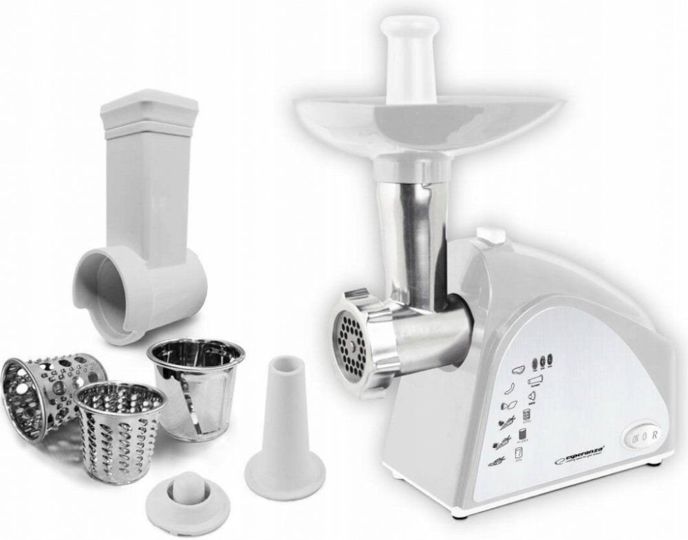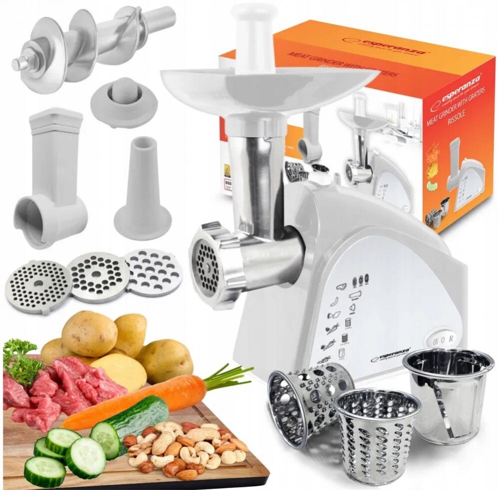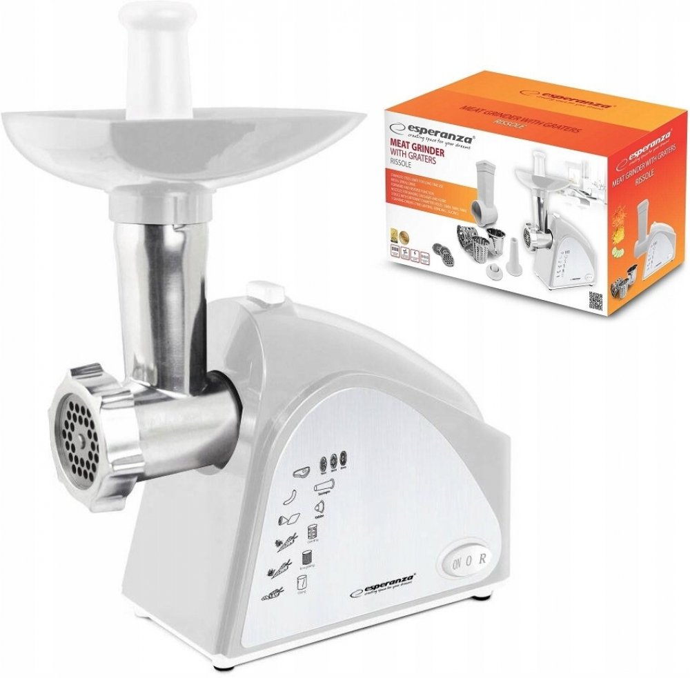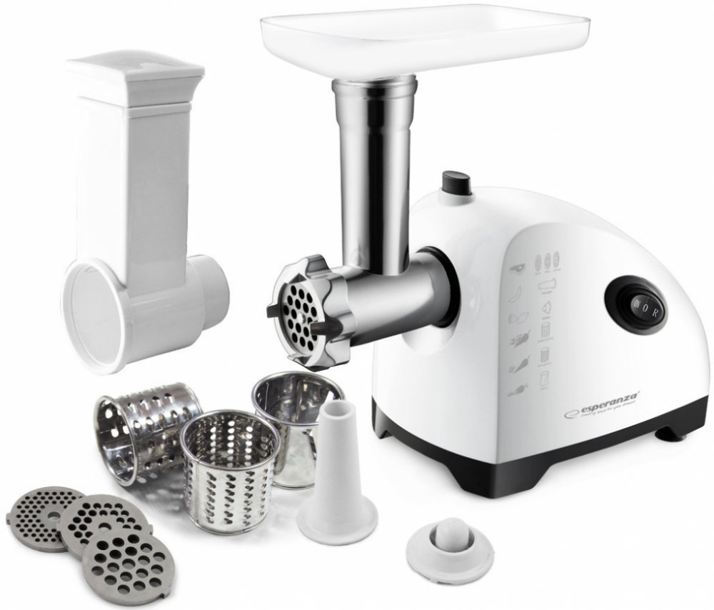 Mlýnek na maso s krouhačem Esperanza RISSOLE je moderní a funkční zařízení, které bude velmi užitečné v každé domácí kuchyni. Zařízení ve funkci „mlýnek“ velmi snadno namele nejen maso, ale i další potravinářské výrobky a další nástavce vám umožní vyrobit klobásu nebo „kebbab“. Esperanza RISOLLE se během funkce „struhadlo“ skvěle hodí pro strouhání ovoce, zeleniny, tvrdého sýra, čokolády, ořechů nebo přípravu crumble.Protiskluzové gumové nožičky zaručují stabilní a bezpečný provoz zařízení.