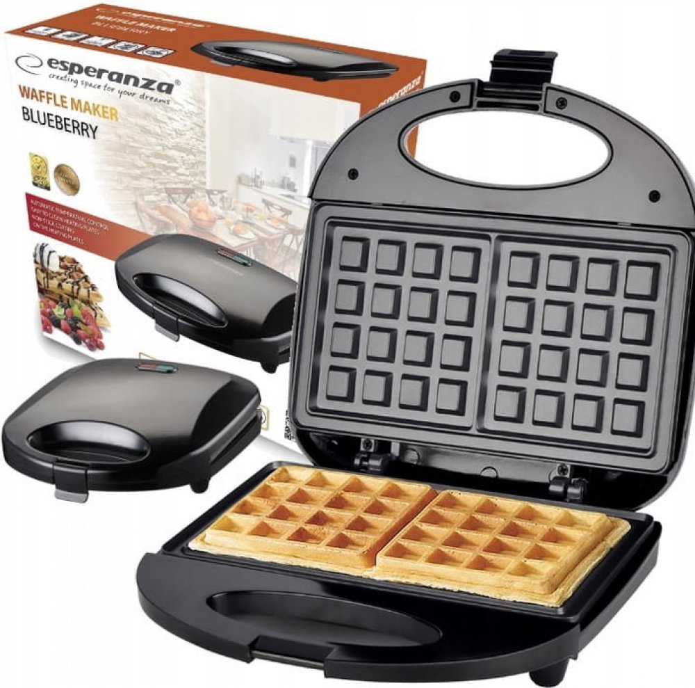 Vaflovač Esperanza Blueberry má topné desky potažené nepřilnavým povrchem, lze jej snadno vyčistit i papírovým ručníkem. Díky rychlému procesu ohřevu připravíte 2 vafle během několika minut. S recepty připojenými k návodu můžete překvapit celou rodinu a servírovat jí doma různé lahodné vafle! Dobrou chuť!