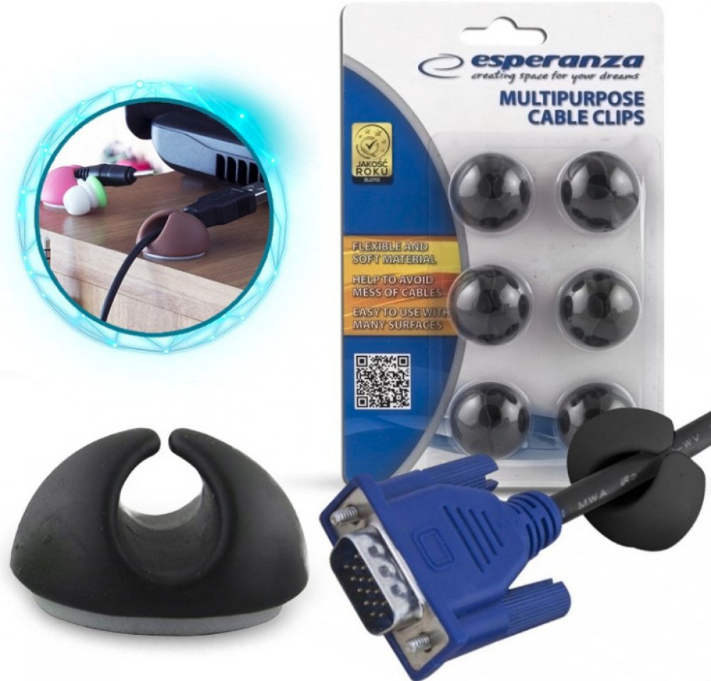Kabelový organizér Esperanza je užitečným pomocníkem pro udržení pořádku ve všech vašich nabíjecích, datových i různých jiných kabelech. Organizéry můžete nalepit na pracovní stůl, noční stolek, palubní desku auta, nebo kamkoliv vás napadne. V balení naleznete celkem 6 organizérů.Vlastnosti: - organizér pro kabely - 6 ks organizérů v balení - snadná instalace