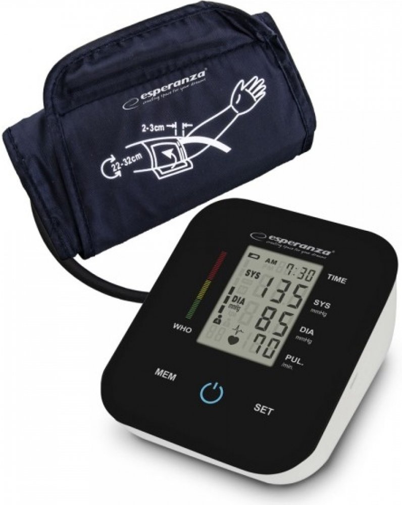 Tlakoměr na rameno LA LENATlakoměr Esperanza LA LENA je moderní lékařský přístroj určený pro rychlé, přesné a pohodlné měření krevního tlaku. Díky oscilometrické metodě měření a pokročilému tlakoparametrickému snímači poskytuje přesné výsledky, které podporují každodenní sledování zdravotního stavu. Intuitivní ovládání a paměť pro měření dvou uživatelů jsou ideálním řešením pro osoby starající se o své zdraví i pro celou rodinu.Technické údaje:Široký rozsah měřeníKompaktní a snadné použitíCelkový záznam až 198 měřeníVelikost LCD displeje: 35 x 50 mmVelikost tlakoměru: 96 x 115 x x 57 mmProvozní teplota: 5 ℃ až 40 ℃Provozní vlhkost: 15% až 80% RHSkladovací a přepravní teplota: -25 ℃ až 55 ℃Skladovací a přepravní vlhkost: 10% - 93% RHRozsah atmosferického tlaku: 80 kPa ~ 105 kPaMetoda měření: oscilometrickáSnímač tlaku: odporovýRozsah měření: DIA: 35-190 mmHg; SYS: 60-250 mmHgPulz: 40 až 180 za minutuRozsah zobrazení tlaku v manžetě: < 300 mmHgPaměť: automaticky uloží 99 měření pro 2 uživatele (celkem 198 měření)Rozlišení měření: 1 mmHgPřesnost: Tlak v rozmezí ± 3 mmHg/pulz ± 3 % odčtené hodnotyNapájení A: 4 x AAA baterie, 1,5 V (nejsou součástí balení)Zdroj napájení B: AC adaptér (není součástí balení): Vstup: 220-240V, 50/60Hz. Výstup: 5V DC 1AUSB kabel: Vstupní port typu C / výstupní port USB 80 cmManžeta: 22-32 cmAutomatické vypnutí: 180 sekund bez operace