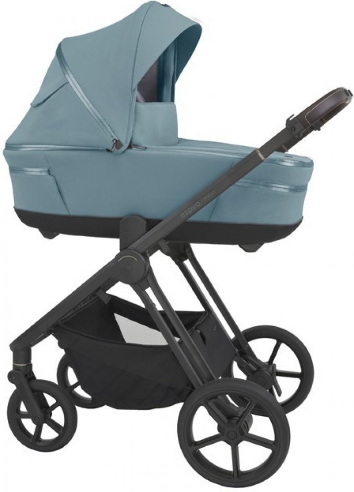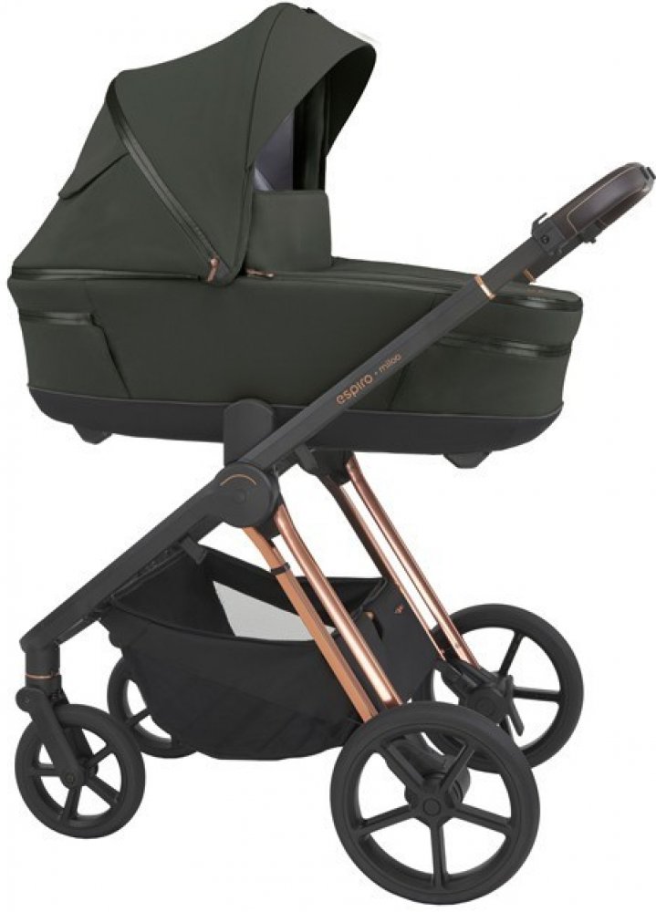 Espiro Miloo je prémiový designový kočárek pro rodiče, kteří se pohybují jak po městském povrchu, tak i po nerovnějších cestách vesnice. Nižší váha a lehká manipulace umožňují ovládání jednou rukou. Zaujme jednoduchým složením spolu s nasazeným sedadlem na konstrukci v jakémkoliv směru, zabudovaným stabilizátorem vibrací hluboké vaničky a možností polohování sedadla do kolmého sedu či úplně rovného lehu. Není třeba ani hledat místo, kam kočárek opřít, protože ve složeném stavu stojí. Obě nástavby patří na trhu k těm prostornějším. Kočárek je možné zakoupit ve více variantách. *Vámi zvolenou možnost si navolíte hned pod fotkami kočárku) Konstrukce jednoruční složení se sportovním sedadlem nasazeným v jakémkoliv směru jízdy, po složení sám stojí a vejde se do průměrného kufru, jaký má například Škoda Octavia, ramenní popruh umožňuje pohodlný přenos kočárku na rameni, i přes svou poměrně nízkou hmotnost 11,4 kg se pyšní kvalitní a odolnou konstrukcí, která zvládne i procházky v lehčím terénu, bezúdržbové nenafukovací pneumatiky plněné gelem společně s odpružením tlumícím nárazy zaručují dobré jízdní vlastnosti, teleskopickou rukojeť je možné nastavit do výšky od 105 do 112 cm, vhodný je tedy pro středně vysoké a vyšší rodiče, propracované detaily podtrhují elegantní vzhled kočárku, prostorný otevřený nákupní košík odnese vše potřebné, možnost připojit stupátko pro staršího sourozence. Hluboká vanička s vnitřním rozměrem 80 x 40 cm je vhodná pro zimní miminko, které má dostatek místa v následujícím zimním období i s fusakem, uzavíratelná ventilační okénka jsou umístěna v prodlužovací XXL stříšce po jejím rozepnutí a na přední i zadní straně vaničky (tzv. panoramatická), příjemně tak ovlivňují proudění čerstvého vzduchu, součástí je prodyšný snímatelný, bambusový matrac s antibakteriálními a protiplísňovými vlastnostmi, který se dá oprat, zabudovaný stabilizátor vibrací, místo v kufru auta ušetří funkce složení na placku, madlo na přenos zabudované v stříšce, je možné měnit výšku hluboké vaničky na konstrukci kočárku pomocí přiložených výškových adaptérů, níže na konstrukci se nasazuje bez adaptérů a výše s nimi, voděodolná látka se zabudovaným UPF 50+ ochranným faktorem, která ochrání miminko i v pochmurném počasí. Sportovní sedadlo vhodné pro větší děti díky vysoké zádové opěrce, zádovou a nožní opěrku je možné nastavit do úplně rovného lehu (180 stupňů), zádová opěrka má funkci kolmého sedu (90 stupňů) a dá se používat jako občasná jídelní židle, jednoruční sklápění zádové opěrky pomocí páčky, výškově nastavitelná stříška poskytuje dítěti dostatek prostoru nad hlavou, prodlužovací XXL stříška s nehlučným, uzavíratelným náhledovým okénkem s funkcí ventilace, sezení po i proti směru jízdy, součástí je madlo, které je možné prakticky odklopit do strany pro lepší přístup k dítěti, součástí je měkká vyjímatelná vložka, 5bodové magnetické bezpečnostní pásy s možností výškového nastavení. Autosedačka s příslušnými adaptéry vlastní autosedačka – Espiro Pi, nebo s příslušnými adaptéry je možné připojit autosedačky známých značek, například Cybex, Maxi-Cosi, Joie, BeSafe, Kiddy atd. Příslušenství Základní výbava kočárku se může lišit v závislosti na Vámi vybrané variantě kočárku. Volitelně dokoupitelným příslušenstvím je skejt. Starší ročníky Espiro Miloo nemá předchůdce, kočárek vyšel na trh v roce 2023.