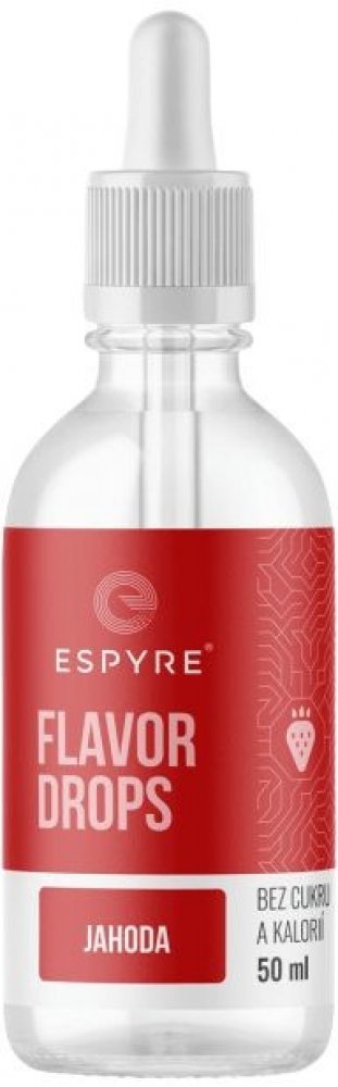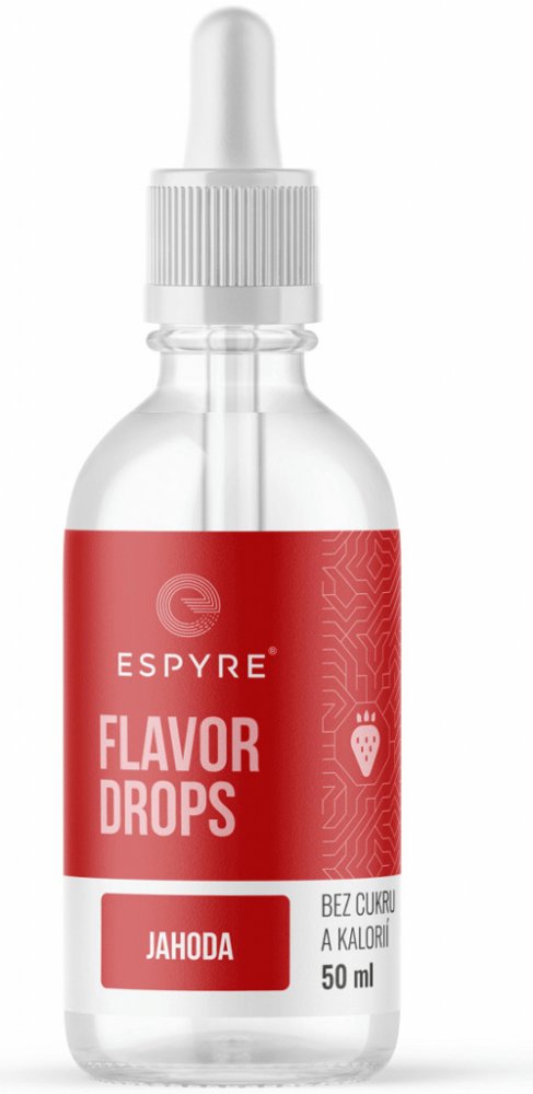 Espyre Flavor Drops jahoda 50 ml . Flavor Drops jsou kapičky, které slouží k ochucení a oslazení jakéhokoliv jídla nebo nápoje. Skvěle se hodí třeba do kaší, jogurtů, kávy, vody nebo je můžeš použít třeba při pečení - fantazii se v tomto směru meze nekladou. Jejich velkou výhodou je, že k ochucení stačí opravdu minimální množství, takže ti lahvička vydrží pěkně dlouho. Flavor Drops neobsahují žádn...