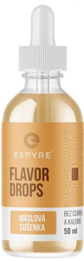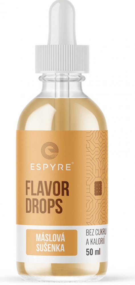 Espyre Flavor Drops máslová sušenka 50 ml. Flavor Drops jsou kapičky, které slouží k ochucení a oslazení jakéhokoliv jídla nebo nápoje. Skvěle se hodí třeba do kaší, jogurtů, kávy, vody nebo je můžeš použít třeba při pečení - fantazii se v tomto směru meze nekladou. Jejich velkou výhodou je, že k ochucení stačí opravdu minimální množství, takže ti lahvička vydrží pěkně dlouho. Flavor Drops neobsah...