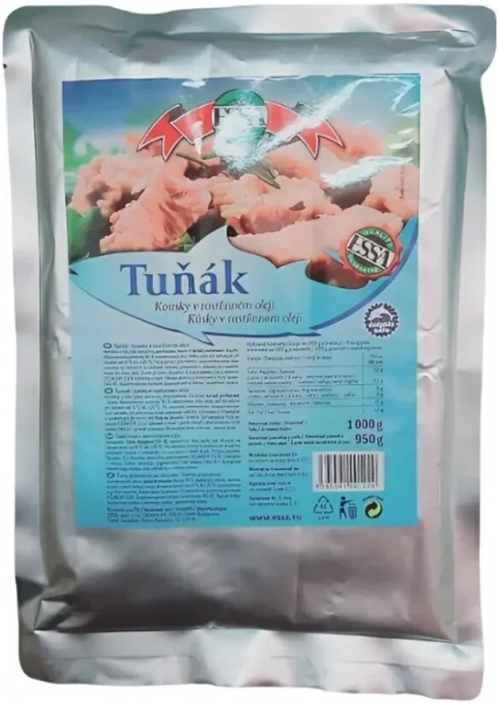 Tuňák kousky v rostlinném oleji ESSA je vhodný do salátů, pomazánek a dalších pokrmů. 95% masa! a pouze 5% rostlinného oleje zaručí opravdu kvalitní zdroj omega3 nenasycených mastných kyselin a bílkovin. Omega3 nenasycené mastné kyseliny mohou mít pozitivní efekt na správnou funkci očí, mozku a srdce. Obsahuje také důležité stopové prvky jódu, vápníku, fosforu a selenu, které mohou snižovat hladinu cholesterolu v krvi. Obsahuje důležité vitamíny A, B2, B12, a v potravinách vzácný vitamin D a vitamin B3 (PP), který je nezbytný pro mozkovou činnost. V jídelníčku by rozhodně neměl chybět, prospívá zdraví a kráse!