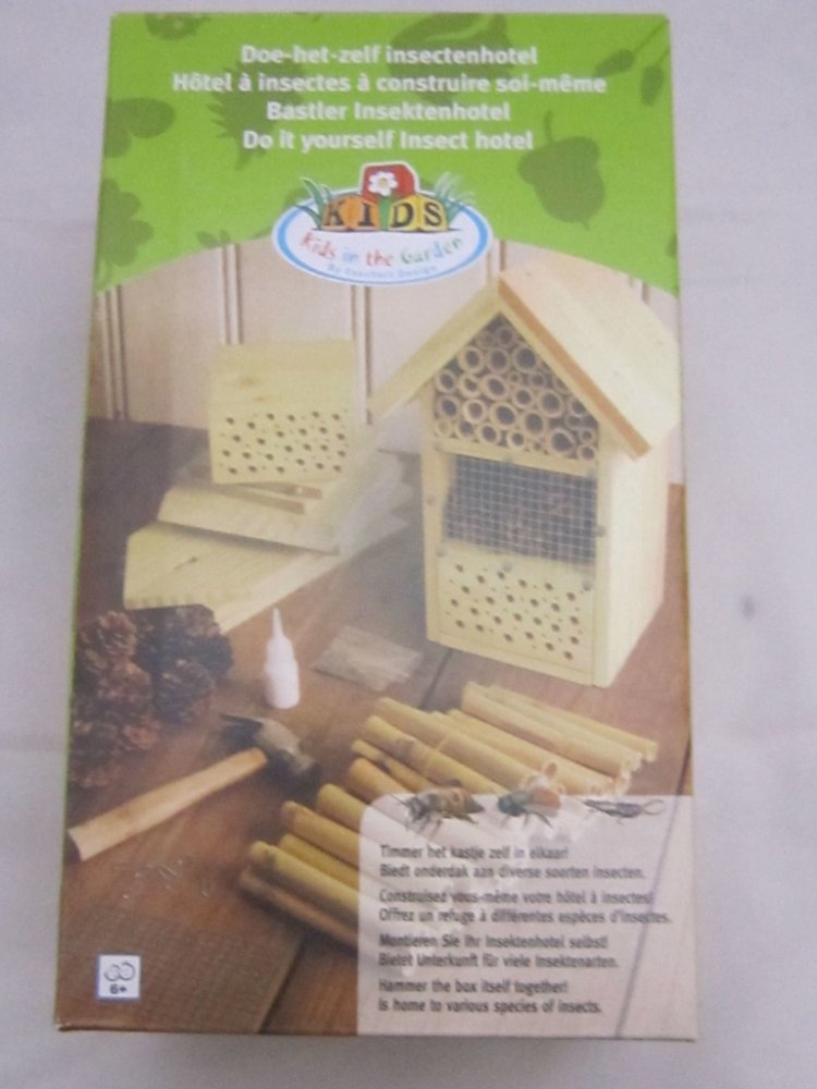 Složte hmyzí hotel dohromady, jak je uvedeno na obrázku. Pak vyplňte vrchní část přiloženými bambusovými stébly a ujistěte se, že bambusové tyčky na sebe dobře navazují. Použijte přiložené lepidlo ke slepení stěn a střechy dohromady. Naplňte prostřední část borovými šiškami a uzavřete přední stranu síťkou. Použijte hřebíky s širokými hlavami, abyste ji zajistili.