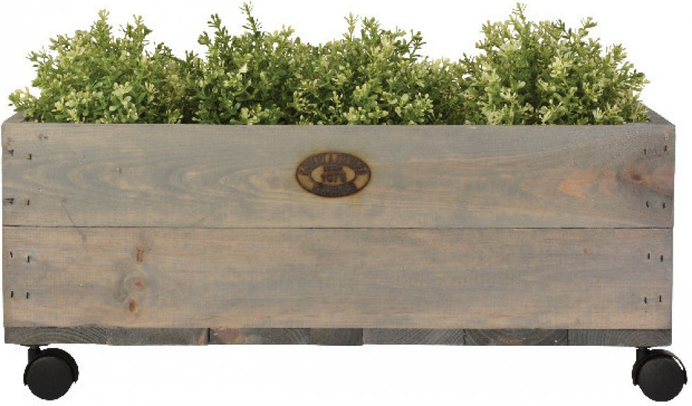 Dřevěný pojízdný truhlík/přepravka. Vhodný pro vkládání květin/ovoce/zeleniny. Se 4-mi otočnými kolečkami v černé barvě. V přírodním barevném zpracování dřeva s našedlou patinou a vypáleným logem ROBERT and STEVENS, SINCE 1875, GROWERS.