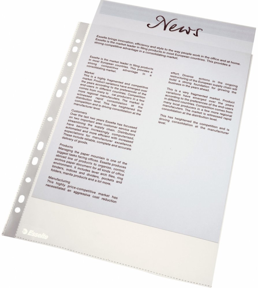 Ekonomická kapsa pro běžné použití a archivaci v pákových a kroužkových pořadačích. Embosovaná recyklovatelná PP fólie tloušťky 0,043 mm (Copysafe). Horní otevření. Univerzální multiperforace (11 děr). Pro formát A4. . . . . . . .