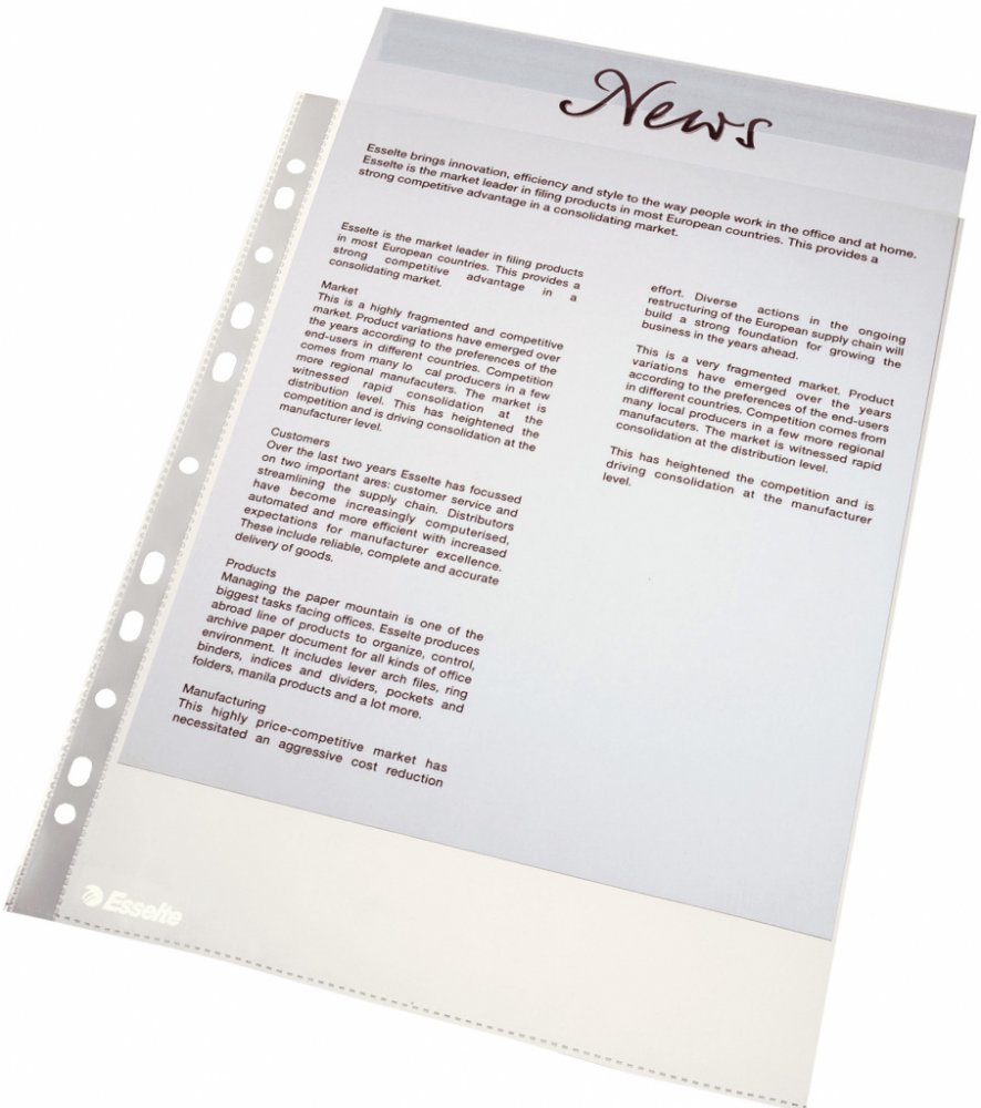 Ekonomická kapsa pro běžné použití a archivaci v pákových a kroužkových pořadačích. Embosovaná recyklovatelná PP fólie tloušťky 0,043 mm (Copysafe). Horní otevření. Univerzální multiperforace (11 děr). Pro formát A4. . . . . . . .