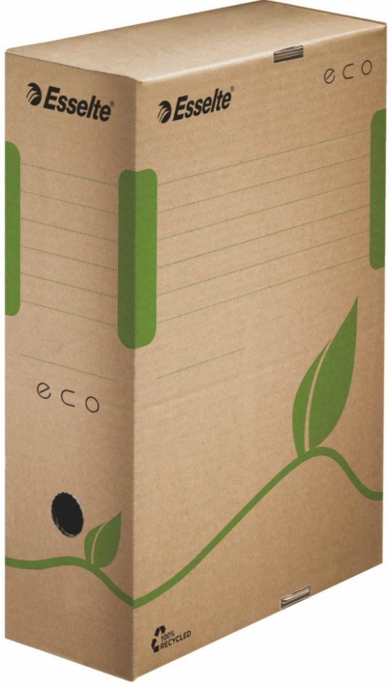 Archivační systém Esselte Eco nabízí funkční krabice navržené s ekologickým přístupem Krabice jsou 100% recyklovatelné, vyrobené z recyklované vlnité lepenky s 85% podílem spotřebitelského odpadu a certifikovány FSC Velikost krabic je optimalizována pouze na papíry A4 s cílem minimalizovat odpad při výrobě
