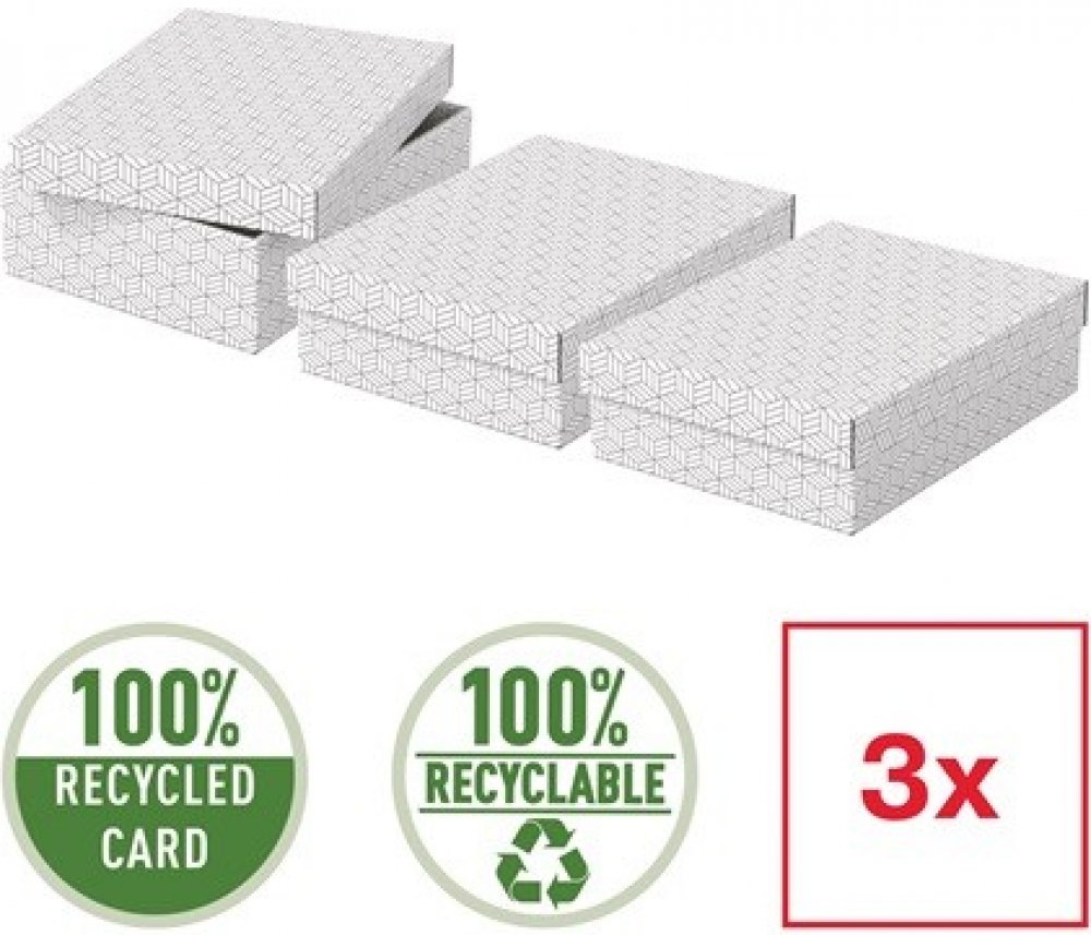 "Sada 3 středních dekorativních lepenkových úložných boxů Esselte Home na dárky nebo na drobnosti v domácnosti. Rychlé a snadné sestaveni.