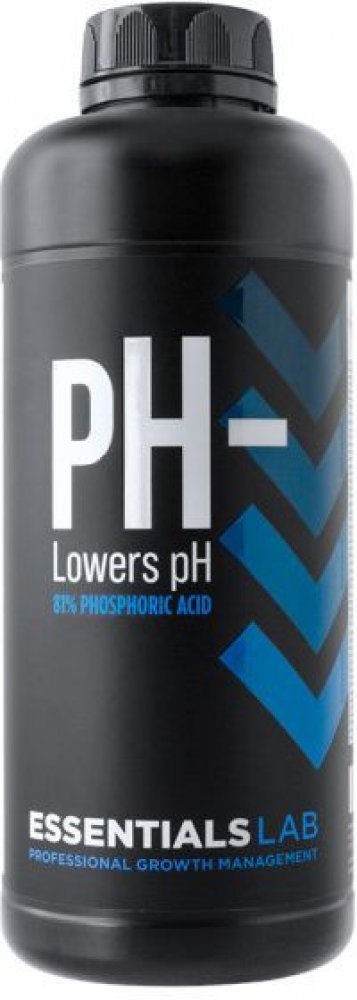 Essentials LAB pH - je koncentrovaná kyselina (81% kyselina fosforečná), kterou lze v malých kontrolovaných dávkách použít ke snížení pH (zvýšení kyselosti) živných roztoků. Důkladně promíchejte a změřte kalibrovaným pH-metrem, abyste dosáhli požadovaného pH. Ideální pro úpravu velkých objemů živných roztoků.