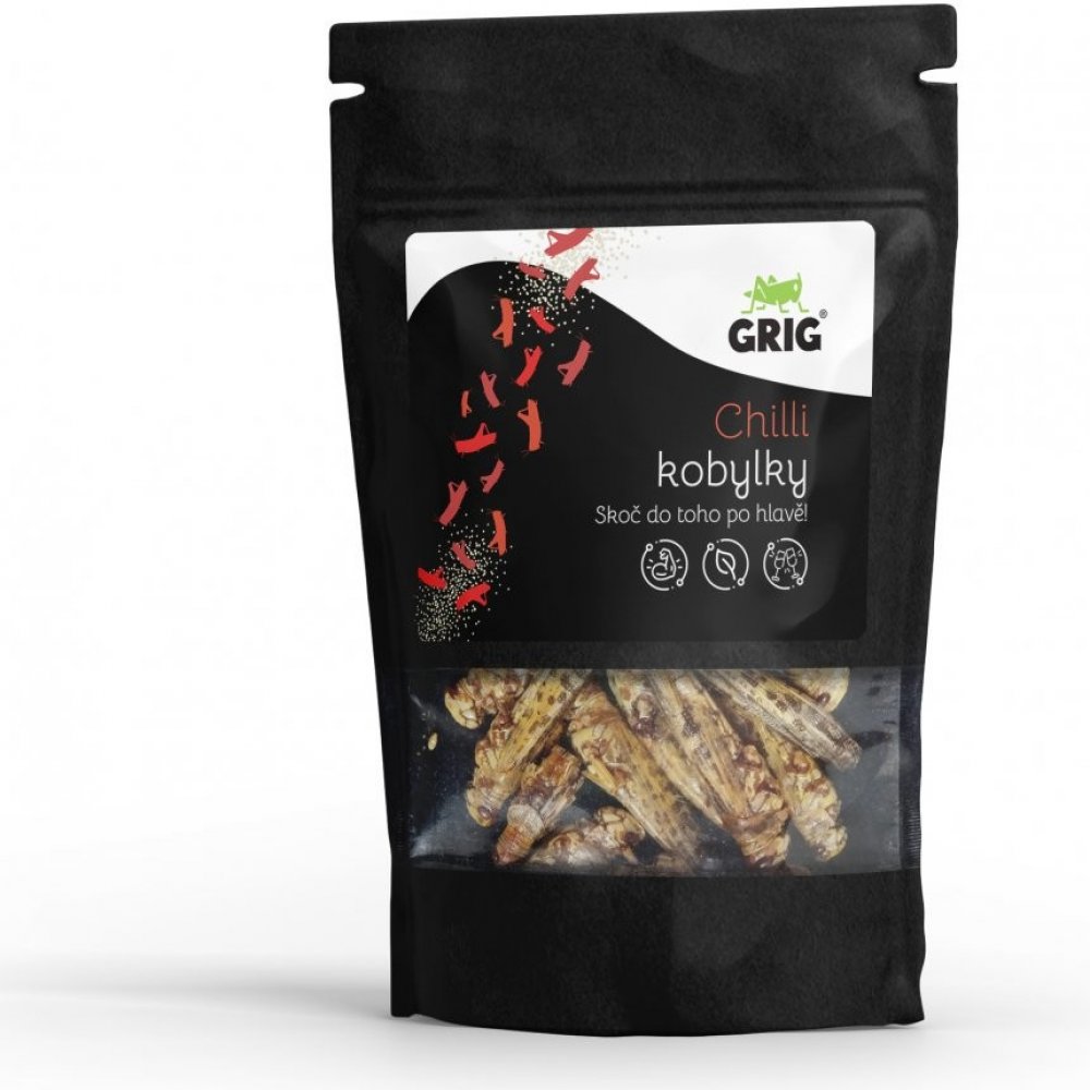 Sušené kobylky (Locusta migratoria) 86 %, slunečnicový olej, čili, sůl.