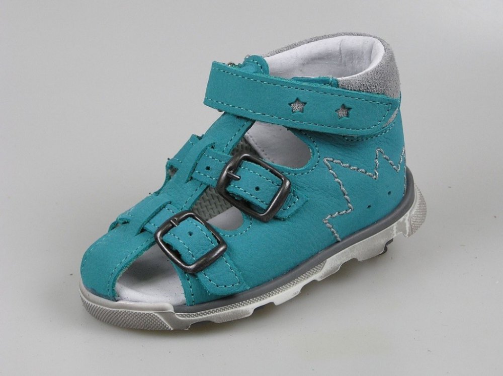 Dětský kožený zdravotní sandál s pevnou patou, koženou stélkou, který dobře drží kotníky ve správném postavení. Sandálky mají pásek přes špičku pro ochranu prstů. Střih dobře sedí, zapínání na suchý zip a dvě přezky přes prsty, dobrá konstrukce boty, kvalitní zpracování.
