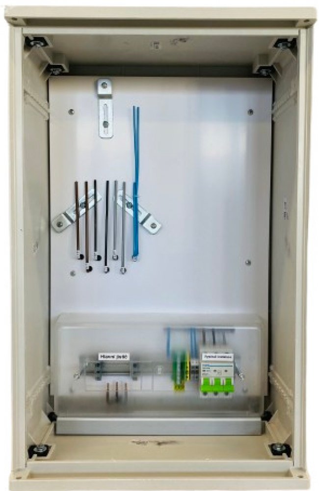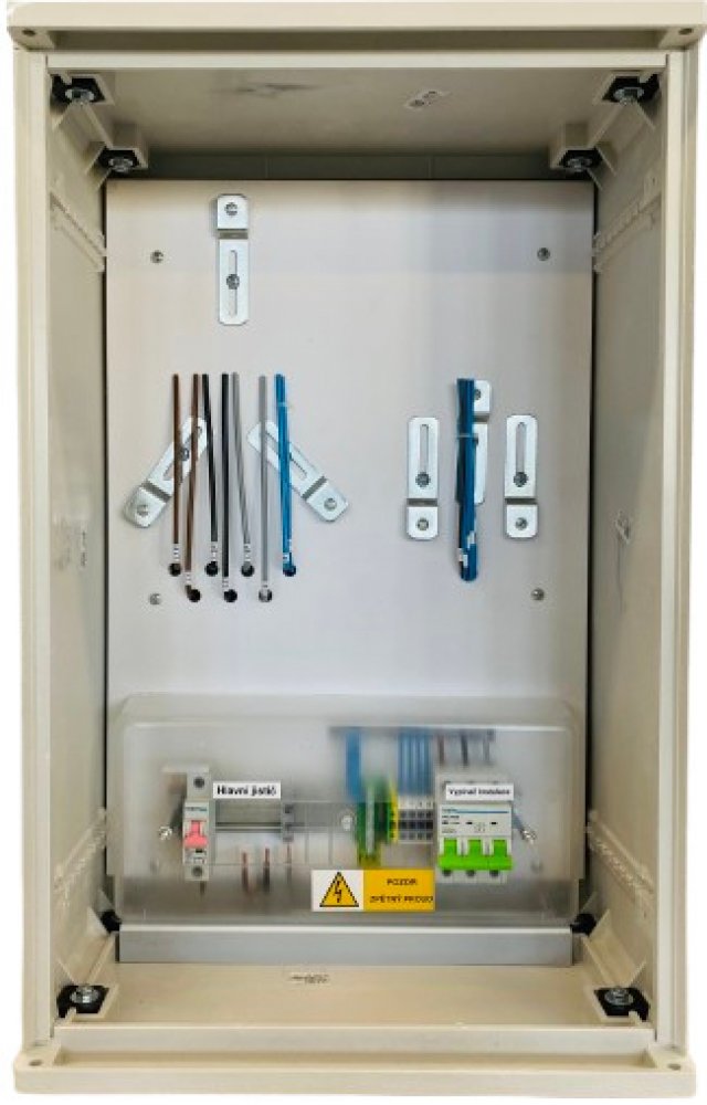 Skříně jsou vyrobeny v celoplastovém provedení z termosetu z SMC-prepreg materiálu, který je odolný proti povětrnostním vlivům, vodě a UV zářením. Prodloužení životnosti je navíc zajištěno UV ochranným nástřikem v barevném odstínu RAL7035. Materiál nepodléhá korozi, zachovává tvar, je nesnadno hořlavý kategorie B a samozhášivý. Vnitřní výzbroj jednosazbová/dvousazbová pro FVE slouží pro měření spotřeby el. energie. Obsahuje nastavitelný držák elektroměru a HDO, jistič přijímače HDO-2B1, svorkovnice PEN, vypínač 63A 3P pro vývod max.16mm2, plombovatelný kryt a místo pro hlavní jistič a ovládací relé OR. Silové vodiče jsou jednotné o průřezu 10mm2 pro osazení hlavního třífázového jističe do 63A. Hlavní jistič není součástí. Závěr rozváděčů je 1-bodový na trnový klíč 6 x 6 mm dle ČSN 359756.