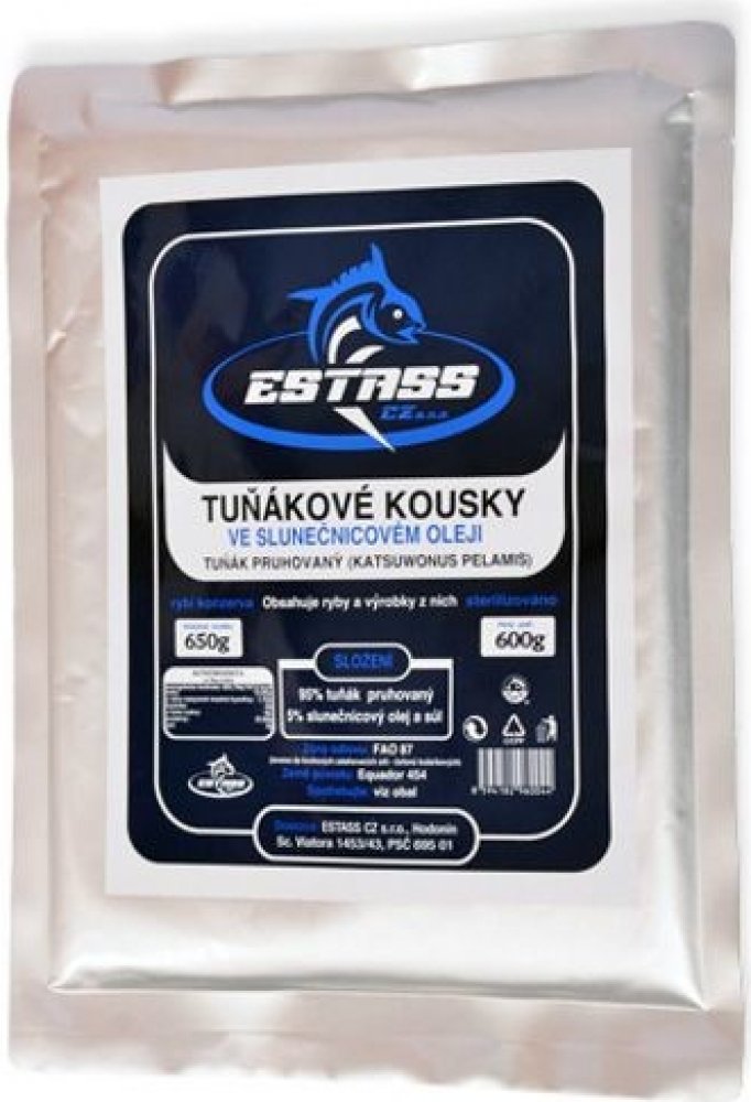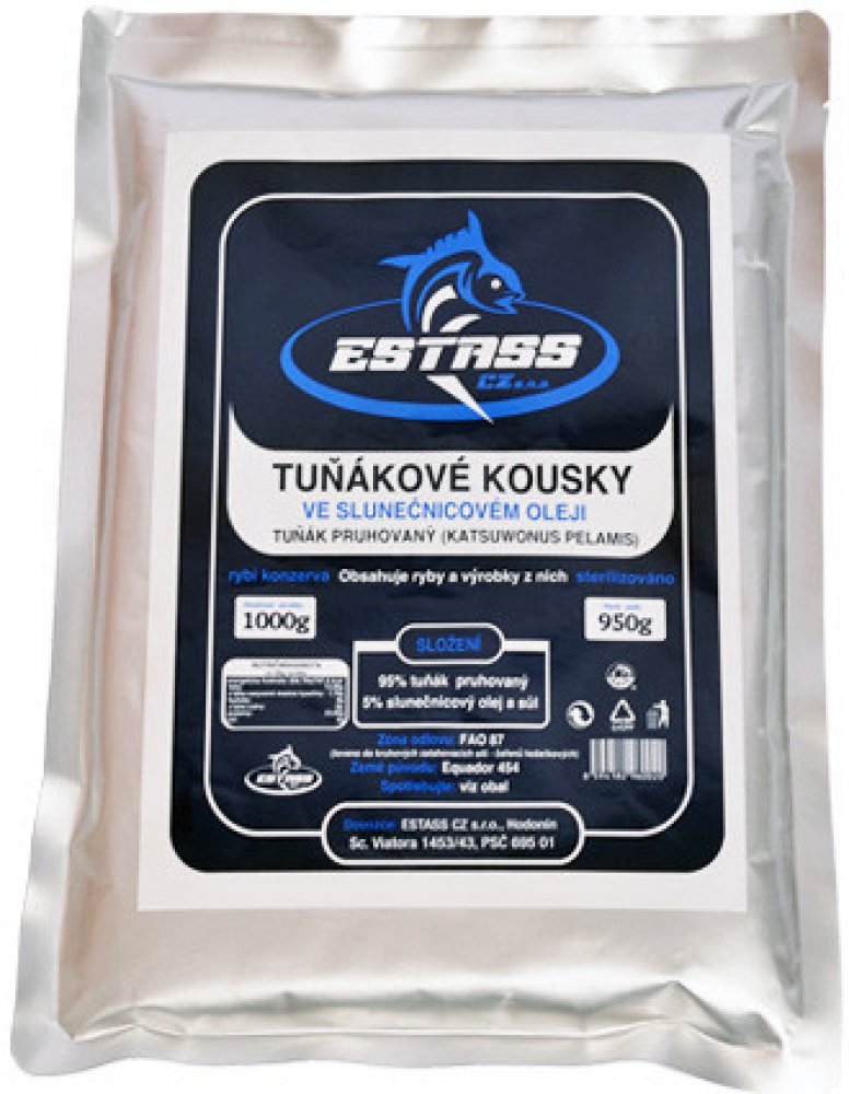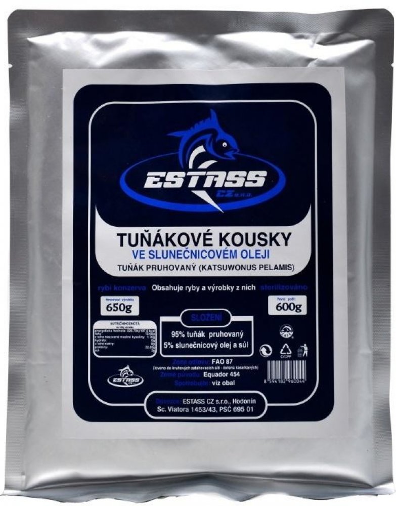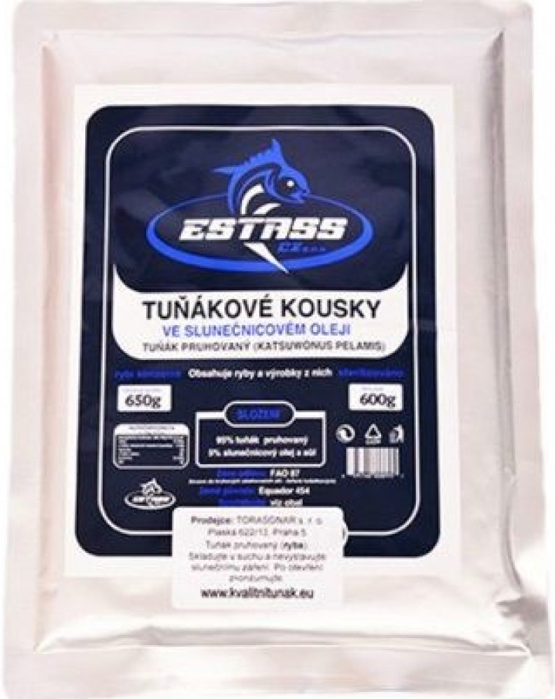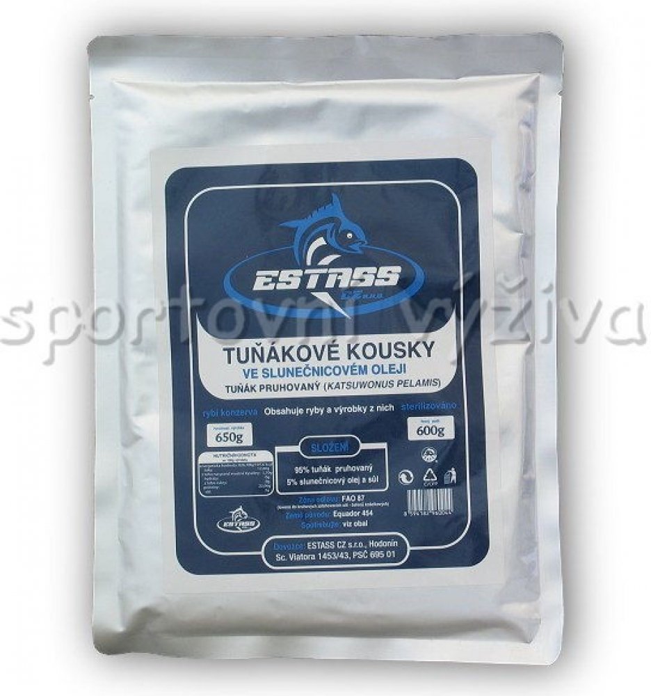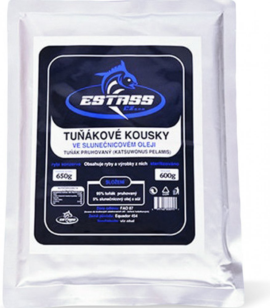 Kvalitní tuňákové kousky Estass ve slunečnicovém oleji obsahují maso tuňáka pruhovaného. Konzervovaný tuňák Estass v tomto balení obsahuje 70% velkých kusů a 25% malých kousků tuňákového masa a 5% slunečnicového oleje. Neobsahuje žádné mleté kosti a kůže, tudíž nezapáchá. Maso je krásně růžové a velmi dobře chutná. Zdravé tuňákové kousky, které mají vysoký obsah bílkovin a malý podíl tuku. Jsou dobrým zdrojem fosforu, železa, draslíku, jodu, zinku či vitamínu A, E, B.