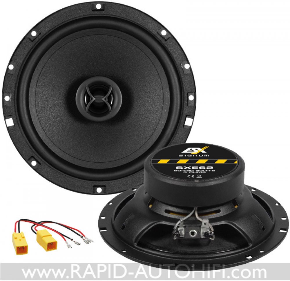 Obsahuje kvalitní koaxiální 2-pásmové reproduktory SXE62 vyšší řady Signum Elite řady německého výrobce ESX a vše potřebné pro korektní výměnu. Tedy montážní redukce a kabelové redukce z originálního kabelového svazku TOYOTA na klasické reproduktorové konektory.
