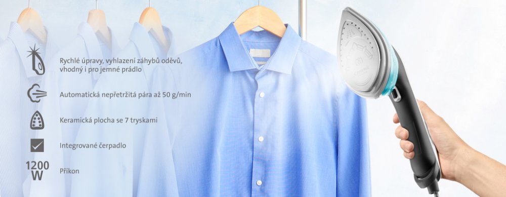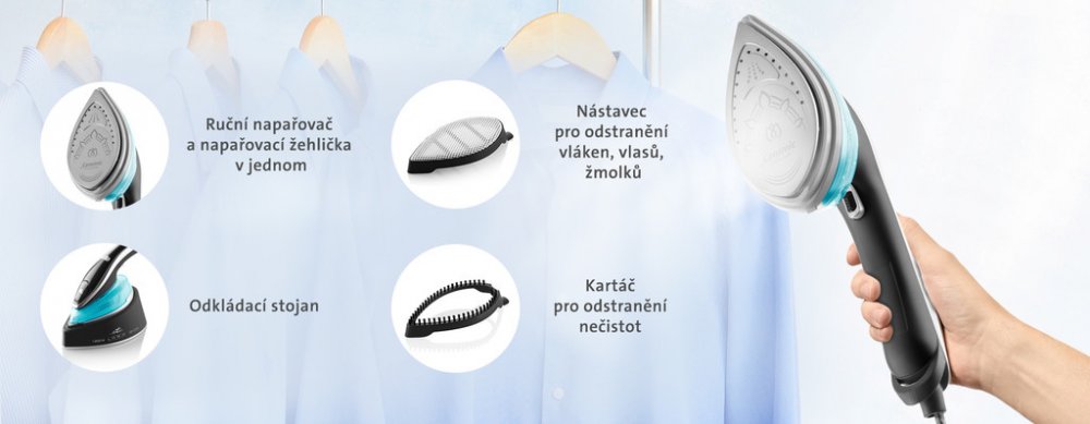 * Pomocí horké páry velmi účinně a rychle zajistí poslední úpravy, vyhlazení záhybů i odstranění nečistot na oděvu