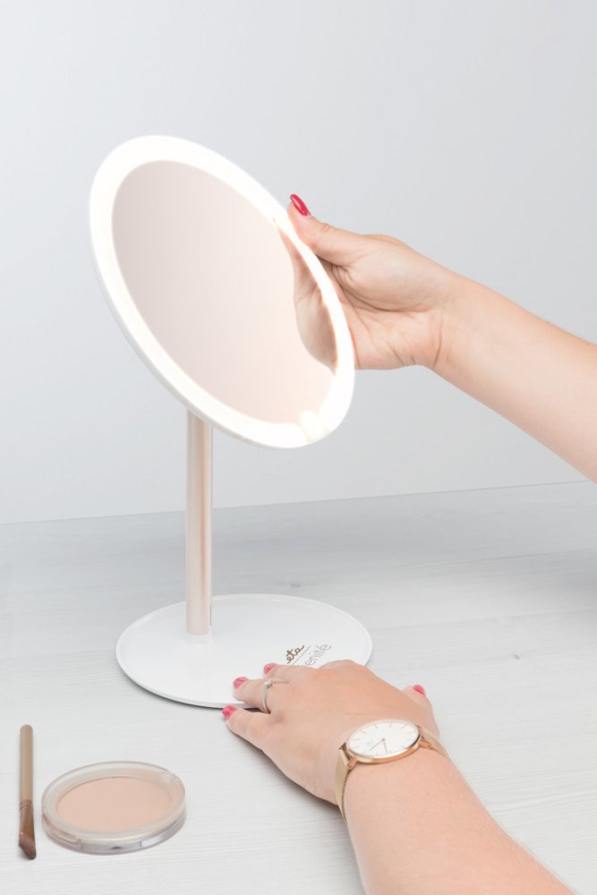 Zrcátko si můžete naklopit až do 90° přesně tak, jak potřebujete. S průměrem 17,8 cm je kosmetické zrcátko připraveno na všechny kosmetické výzvy, a přitom nezabere zbytečně moc místa.