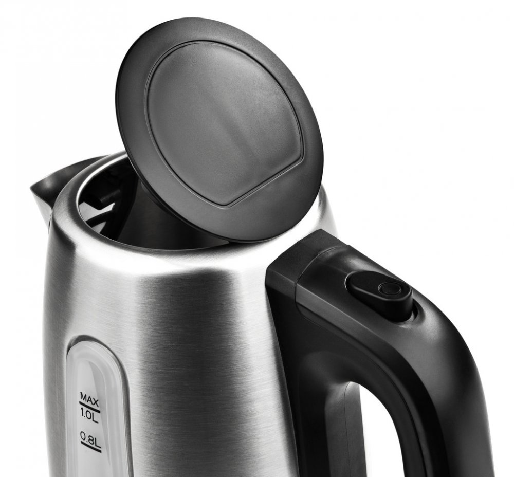 Malá nerezová konvice pro rychlý ohřev až 1 litru vody. Má oboustranný vodoznak, světlenou kontrolku provozu a skryté topné těleso.