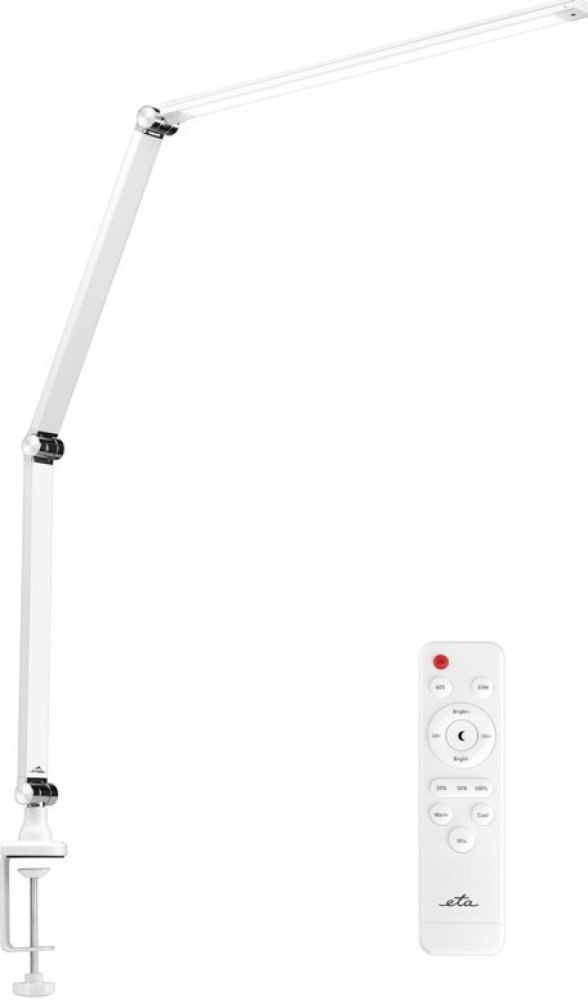 Stolová LED lampička ETA bola navrhnutá špeciálne na osvetlenie pracovných stolov. Vďaka flexibilnému upínaciemu mechanizmu ju ľahko primontujete na okraj dosky každého bežného stola. Nastaviteľné ramená umožňujú ľahko nájsť požadovanú polohu pre ideálne osvetlenie. Lampička ponúka uhol osvetlenia 120 °, takže si poradí aj s veľkým pracovným priestorom. Lampičku môžete následne aj ľahko sklopiť, pokiaľ ju nepotrebujete aktuálne používať.