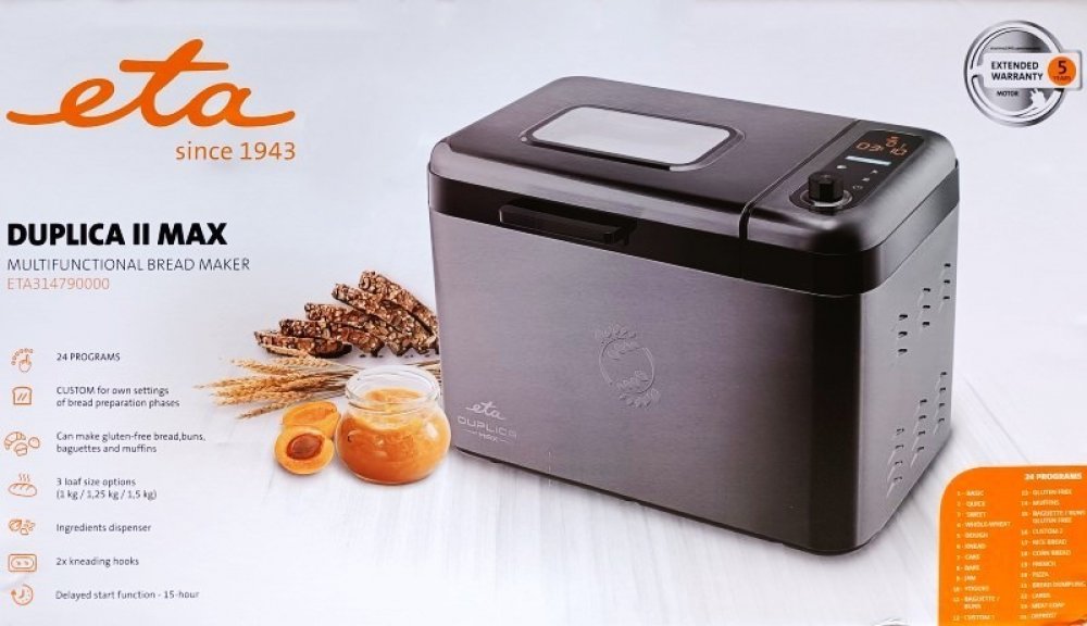 Probuďte se do vůně čerstvě upečeného chleba s domácí pekárnou ETA Duplica II a ke kupovanému pečivu už se nebudete chtít vracet. Pekárna vám nabídne až 24 přednastavených programů, včetně programů pro různé druhy chleba, bezlepkového pečiva, jogurty, těsta na pizzu nebo kynutý knedlík. Pusťte se do domácího pečení a vsaďte na kvalitu a čerstvost.