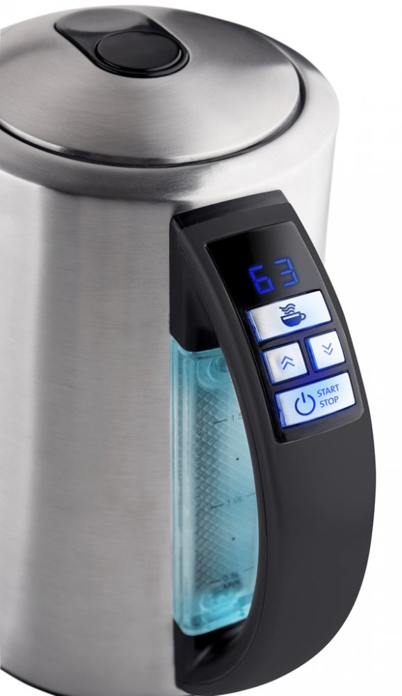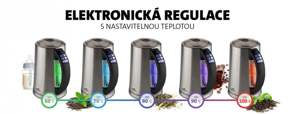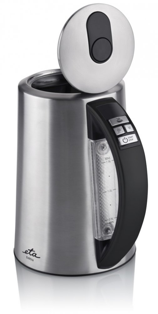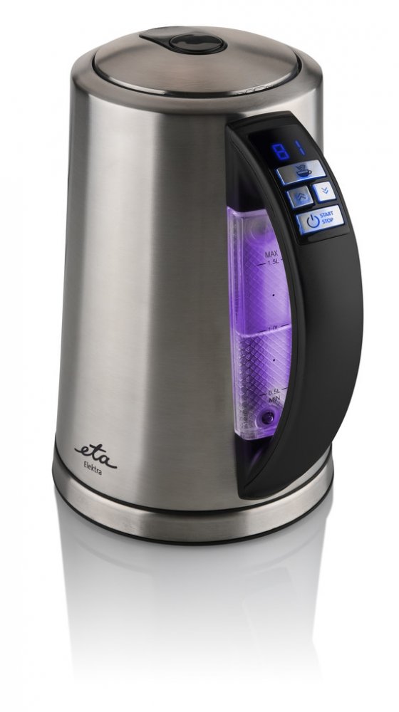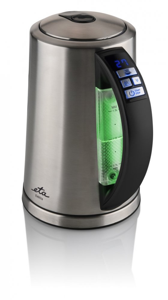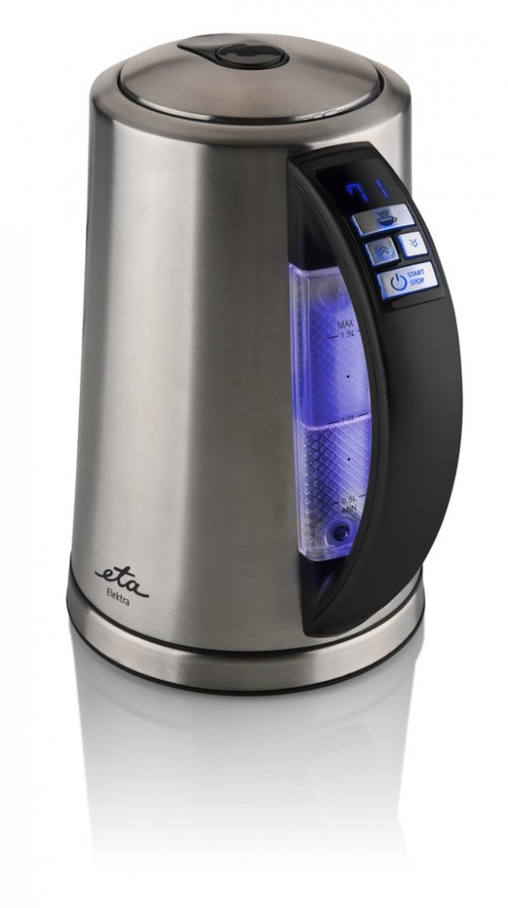 Rychlovarná konvice v nerezovém provedení s funkcí zobrazení teploty vody. ETA Elektra 3597 90000 zaujme LED displejem, na kterém si snadno nastavíte požadovanou teplotu vody od 40 do 100 °C. Na změnu teploty vody vás upozorní barevné podsvícení na vodoznaku v zadní části konvice. Samozřejmostí je bezpečnostní tepelná pojistka. Rychlovarná konvice ETA Elektra 3597 90000 v nerezovém provedení vyhoví potřebám i těch nejnáročnějších zákazníků. Její hlavní výhoda spočívá v LED displeji s modrým podsvícením, na kterém se zobrazuje teplota vody, která se v konvici právě vaří. Jakmile voda dosáhne požadované teploty, upozorní vás světelná a zvuková signalizace. Různé druhy nápojů vyžadují k přípravě odlišnou teplotu vody. S konvicí ETA Elektra 3597 90000 už nemusíte naslepo odhadovat, v jakou chvíli konvici vypnout. Jednoduše si nastavíte požadovanou teplotu od 40 do 100 °C a konvici zapnete. Konvice se navíc zbarví do určité barvy, která přísluší vámi zvolené teplotě. Teplotu dokáže konvice i udržet.