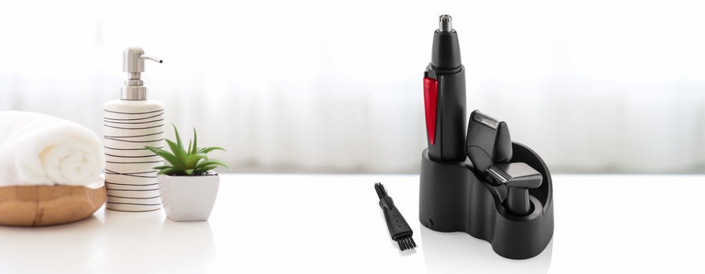 V příslušenství najdete 3 nástavce. Pomocí prvního nástavce odstraníte nadbytečné chloupky z nosu, uší a pro úpravu obočí. Druhý nástavec slouží k zastřihování kontur vousů, kotlet a vousů. A poslední nástavec je určený pro holení. Zastřihovač po použití snadno očistíte pomocí čistícího kartáčku a uzavřete ochranným krytem. Součástí balení je i praktický stojan.