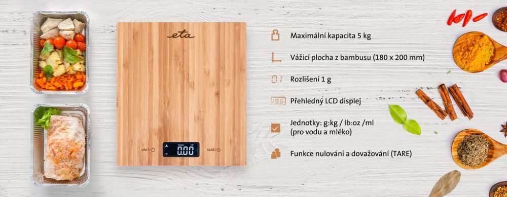 Digitální kuchyňská váha ETA Bambi s bambusovou vážicí plochou je jako stvořená pro každodenní asistenci v kuchyni. Kromě vážení všech druhů surovin také dokáže změřit objem nejčastěji používaných tekutin, jako je voda či mléko.