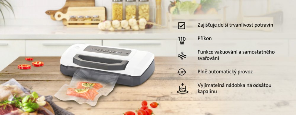 * Plně automatická: uzavřením pevně zajistí fólii, odsaje vzduch, zataví spoj