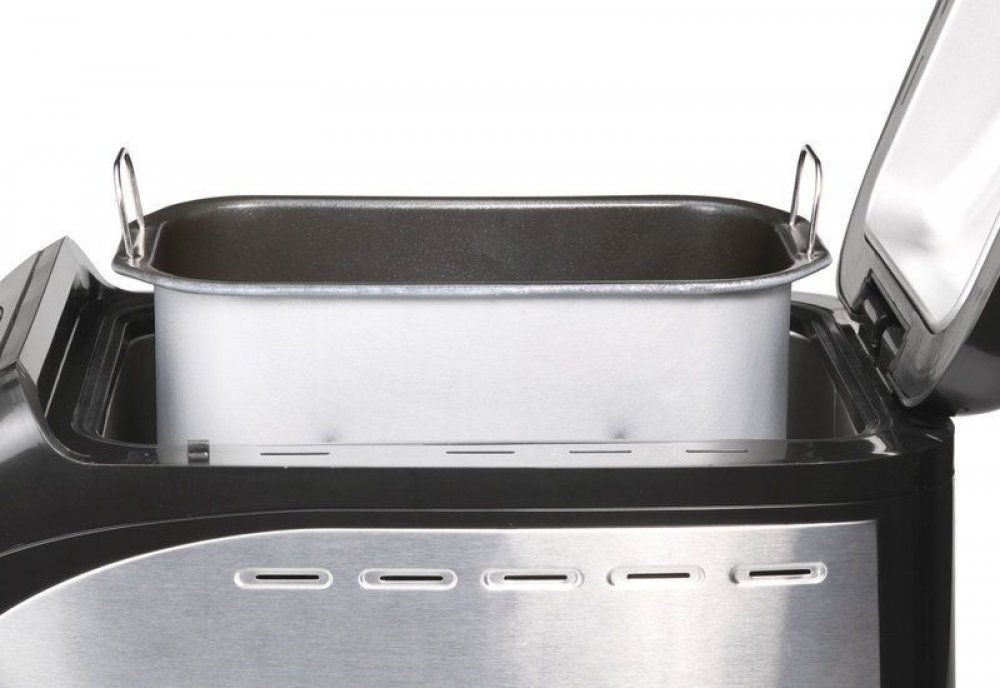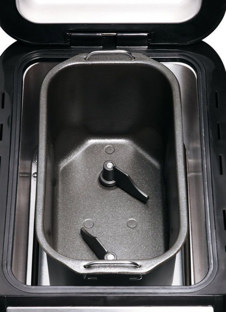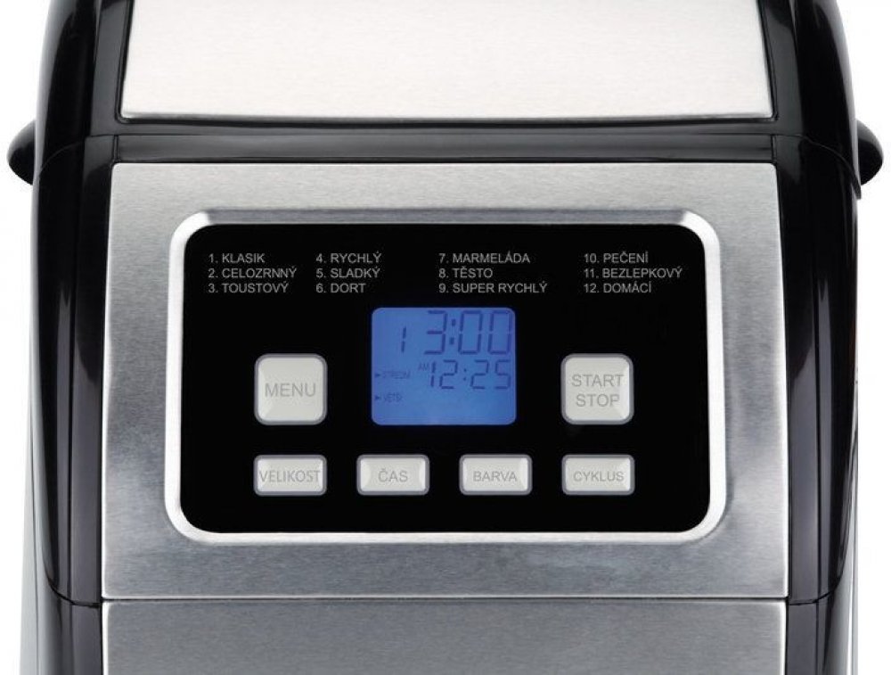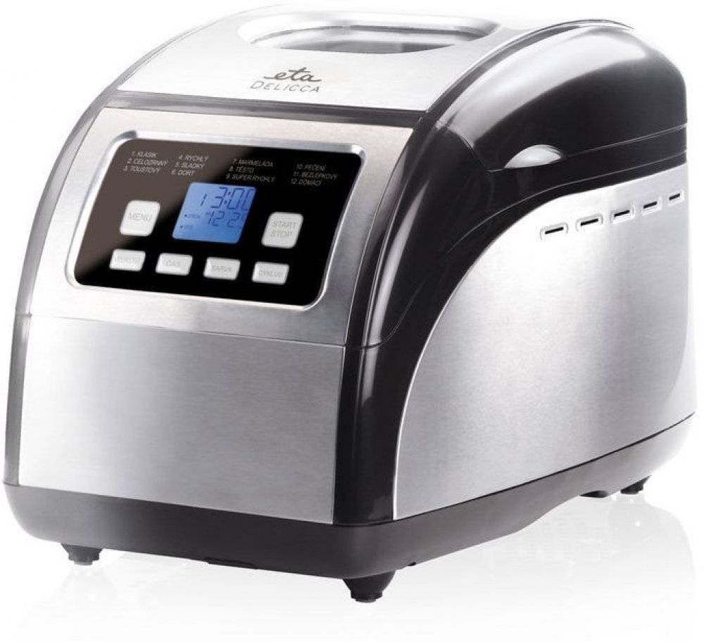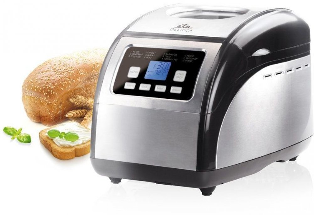 ETA 7149 90000 DELICCA domácí pekárna chleba, příkon 800 W, maximální objem chleba 1,5 kg, plně automatická příprava těsta a chleba, možnost přípravy bezlepkového chleba, 12 přednastavených programů pro přípravu chleba, 1 přednastavený program pro přípravu džemů, 3 možnosti volby množství chleba, 3 možnosti volby barvy chlebové kůrky, možnost zpoždění začátku přípravy, tlačítko PAUSE pro přerušení nastaveného programu, paměť při výpadku el. proudu, zobrazení denního času i při stavu nečinnosti, barva černá/nerez