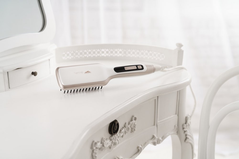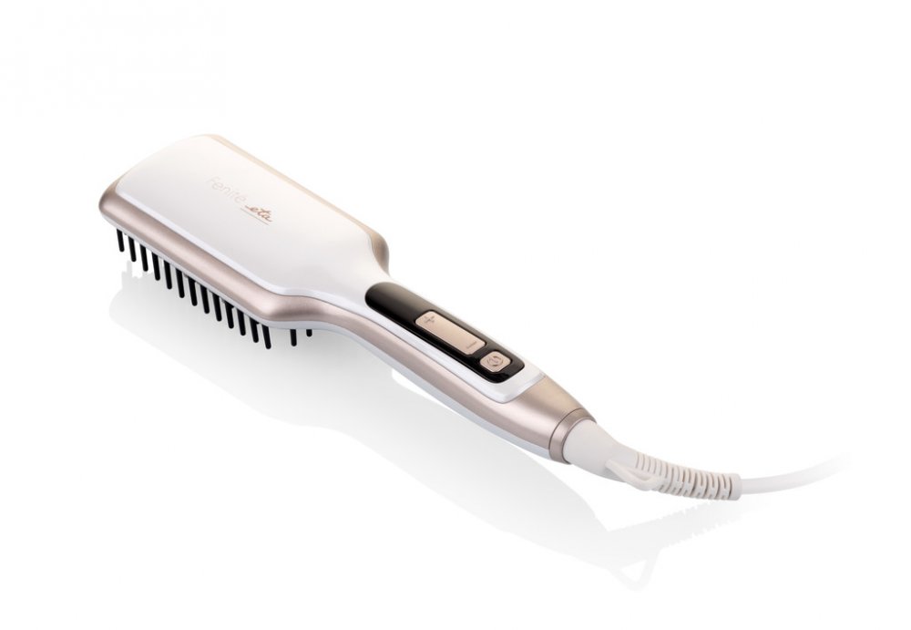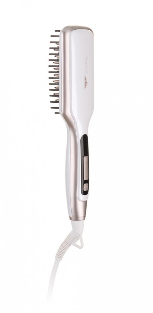 Žehlicí kartáč na vlasy Fenité propůjčí vašemu účesu eleganci a dodá mu ten správný šmrnc. Několika tahy vlasy účinně, ale přirozeně narovná a to navíc zcela bez rizika popálení. Plastové špičky jeho hrotů totiž zůstávají studené i během provozu. Funkce ionizace dodává vlasům vytouženou jemnost a lesk a zároveň usnadňuje dosažení požadovaného účesu. Zvolená teplota se zobrazuje na přehledném LED displeji a její nastavení i veškeré další ovládání je zcela snadné.