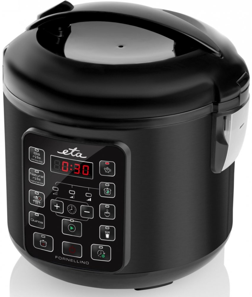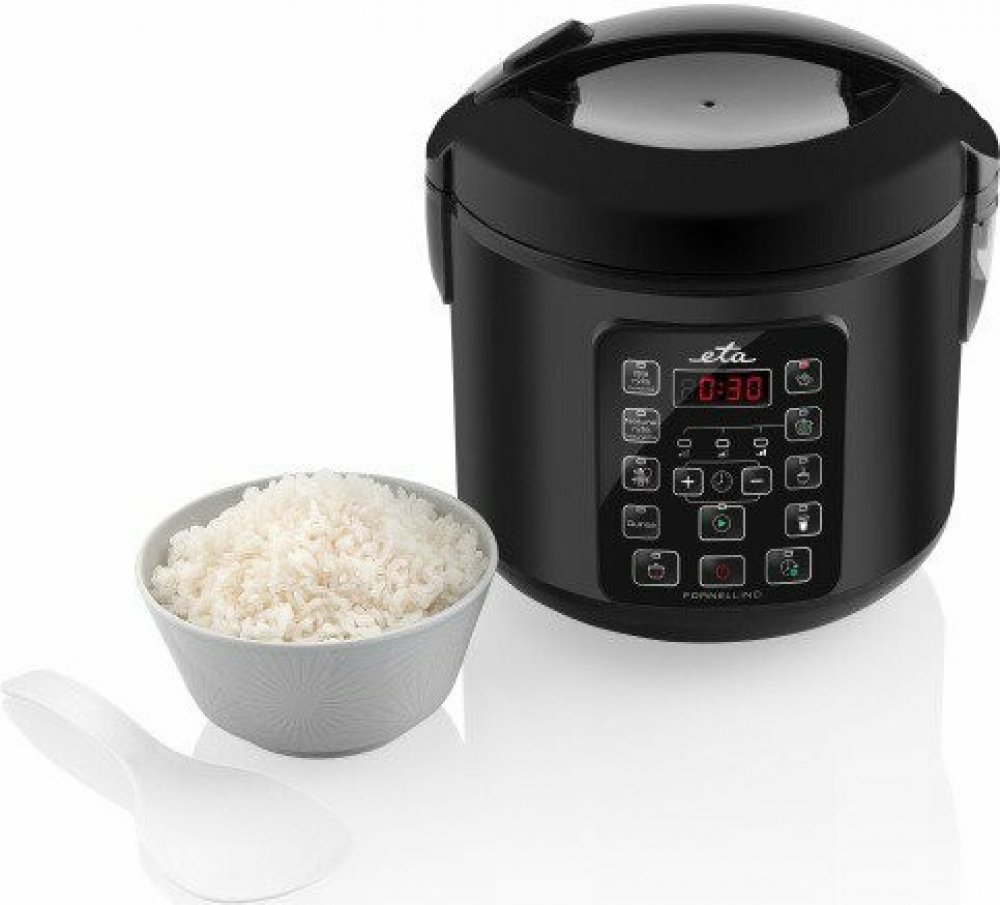 Rýžovar rozhodně patří mezi kuchyňské pomocníky, při jejichž pořízení litujete jedině toho, že jste si je nepořídili už dávno. Multifunkční rýžovar zvládá nejen rýži, ale dokonale připraví i luštěniny, polévky i oblíbené snídaňové cereálie. Vaření rýže nikdy nebylo tak snadné. S multifunkčním rýžovarem ETA Fornellino budete mít perfektně uvařenou rýži už pokaždé, navíc téměř bez práce. ETA Fornellino se o vše postará sám, a to díky zcela automatickému provozu. Po dovaření navíc udržuje teplotu, a to až 12 hodin. Rýží to u nás nekončí. Vybrat si můžete až z 9 přednastavených programů a ETA Fornellino se tak stane multifunkčním pomocníkem pro všechny příležitosti. Bílá rýže – program pro klasické vaření bílé rýže. Hnědá rýže – program pro vaření hnědé rýže. Hnědá rýže potřebuje více času na přípravu než rýže bílá. Vaření s otevřeným víkem – tato funkce vám přijde vhod pro osmahnutí a orestování surovin, typicky před vařením nebo pomalým vařením. Během tohoto programu nechte víko otevřené. Quinoa – díky této funkci uvaříte perfektní quinou.