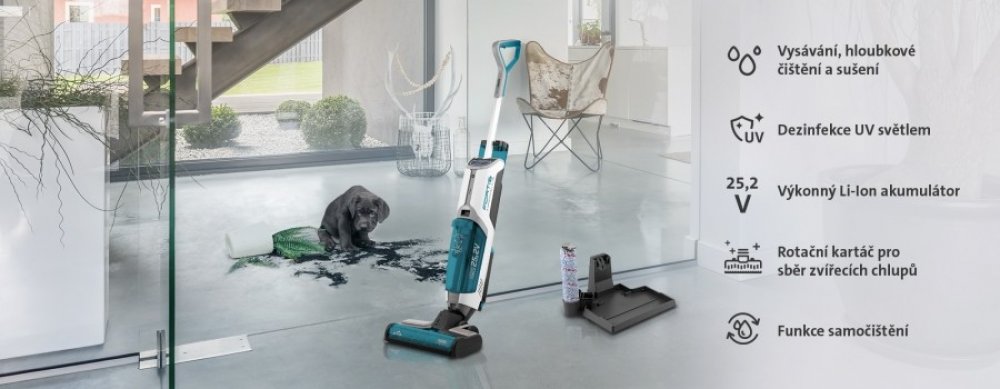 Tyčový vysavač vysává, hloubkově čistí, suší a dezinfikuje v jednom kroku. Je vybaven výkonným 25,2V Li-Ion akumulátorem s výdrží až 45 minut.