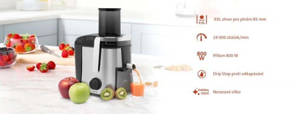 Odšťavňovač ETA Fresher II se 2 rychlostními stupni a velkým plnícím otvorem. Ideální pro přípravu čerstvé šťávy každá den.