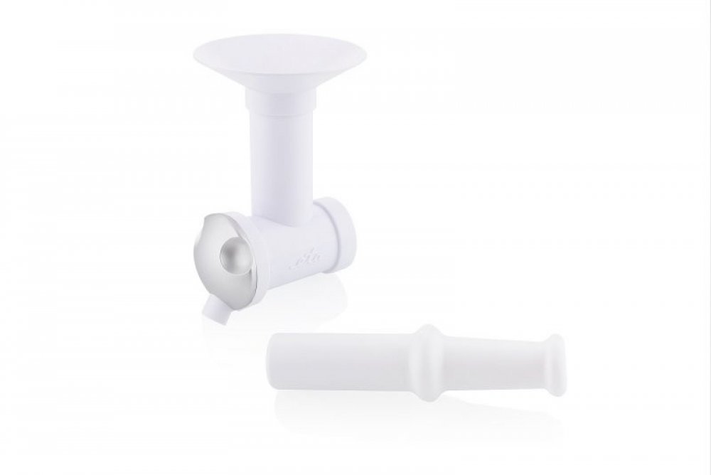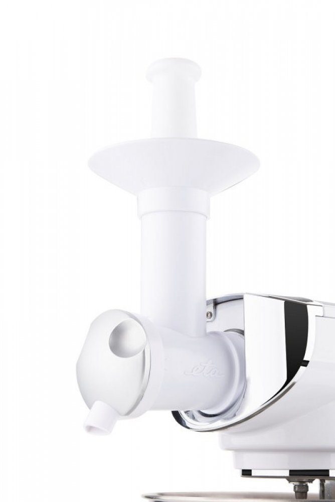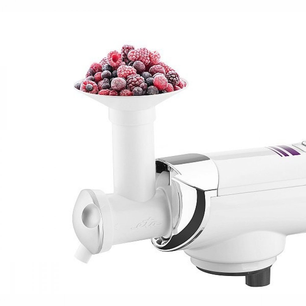 Sestavíte ho jednoduše a rychle. Jeho údržba je snadná díky kompletně rozebíratelnému mechanismu a jednotlivé díly můžete mýt i v myčce na nádobí. Zmrzlina bude mít velmi jemnou strukturu, díky 36 nerezovým nožům, které zpracovávají suroviny velmi šetrně. Plnící otvor umožňuje vkládat i větší kusy ovoce. Pomůžete si pěchovadlem, které posouvá suroviny směrem k noži k jejich rozmělnění.