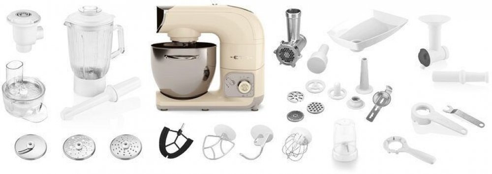 Robot se pyšní bohatou základní výbavou. Zvládá šlehání, mísení, hnětení, mixování, strouhání, mletí masa, plnění uzenin, tvorbu masových trubiček Kebbe, protlačení strojového cukroví, a dokonce i výrobu domácí zmrzliny, ledového krému včetně mraženého jogurtu.