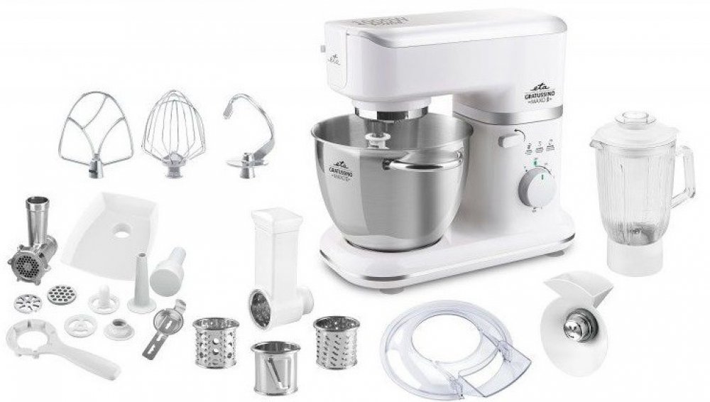 Velká nerezová nádoba o objemu 4,5 l pojme velké množství surovin a je snadno odnímatelná. Otvor v krytu umožňuje přidávání dalších surovin přímo za chodu, bez zbytečného zdržování a vypínání. Přístroj nabízí funkce planetárního míchání, hnětení, šlehání, mixování, mletí, strouhání atd. V neposlední řadě je součástí robotu Eta také mlýnek na maso (průměr 54 mm) s kovovou mlecí komorou, mechanickou pojistkou proti přetížení strojku s 3 velikostmi mlecích destiček nebo také nástavcem pro plnění uzenářských produktů (klobás, párků, jitrnic), Kebbe, 4 typy struhadla a mlýnkem na mák. Ve skleněném mixéru objemu 1,4 l si díky nerezovým nožům snadno připravíte osvěžující ovocný nebo zeleninový koktejl. Zde je opět ve víku otvor pro pohodlné doplňování surovin. Jednotlivé díly je možné mýt v myčce nádobí. Bohaté příslušenství obsahuje také plastovou násypku, pěchovadlo a uvolňovací klíče. ETA na tento produkt navíc poskytuje prodlouženou záruku 5 let na motor.