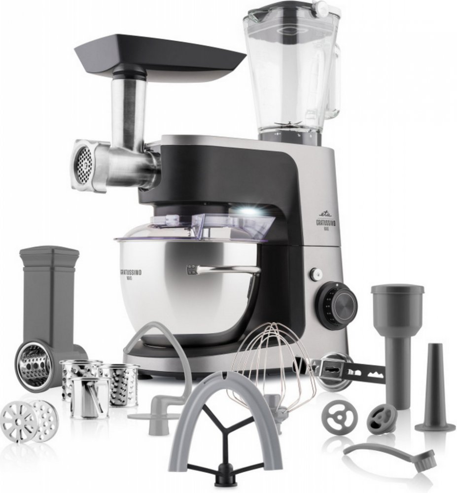 Multifunkční kuchyňský robot ETA Gratussino III Maxo s kovovými převody a bohatou výbavou šlehá, míchá i hněte těsto. Poradí si také se strouháním zeleniny, mletím masa a hravě umixuje zdravé smoothie, polévky i lahodnou zmrzlinu.