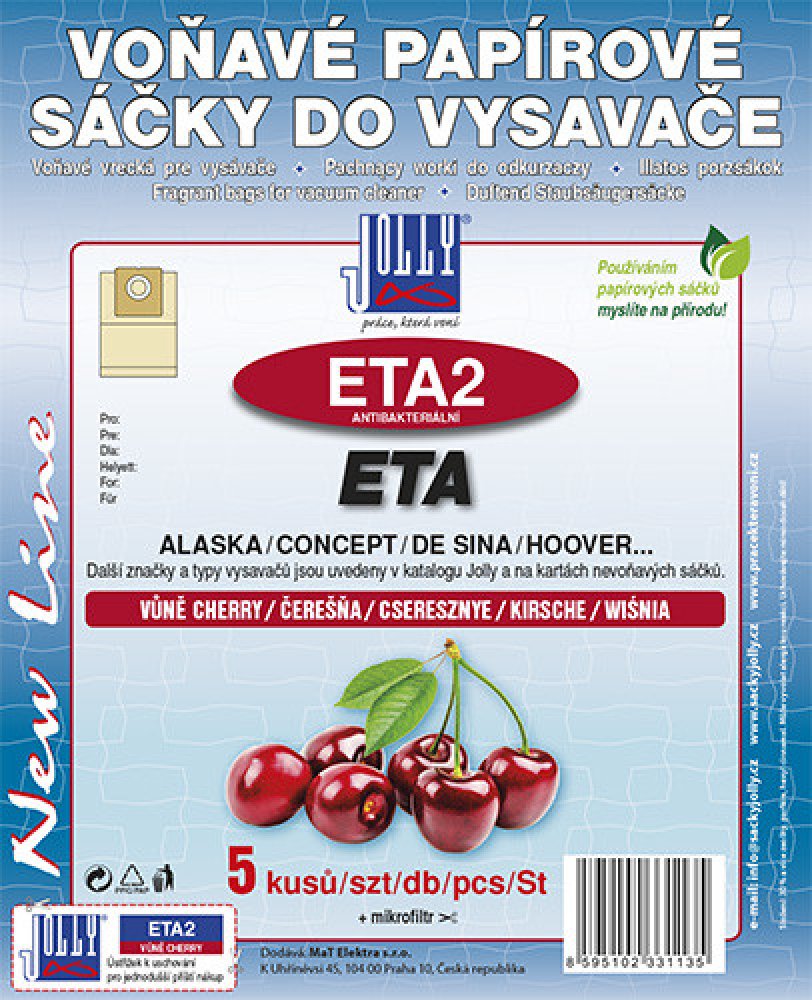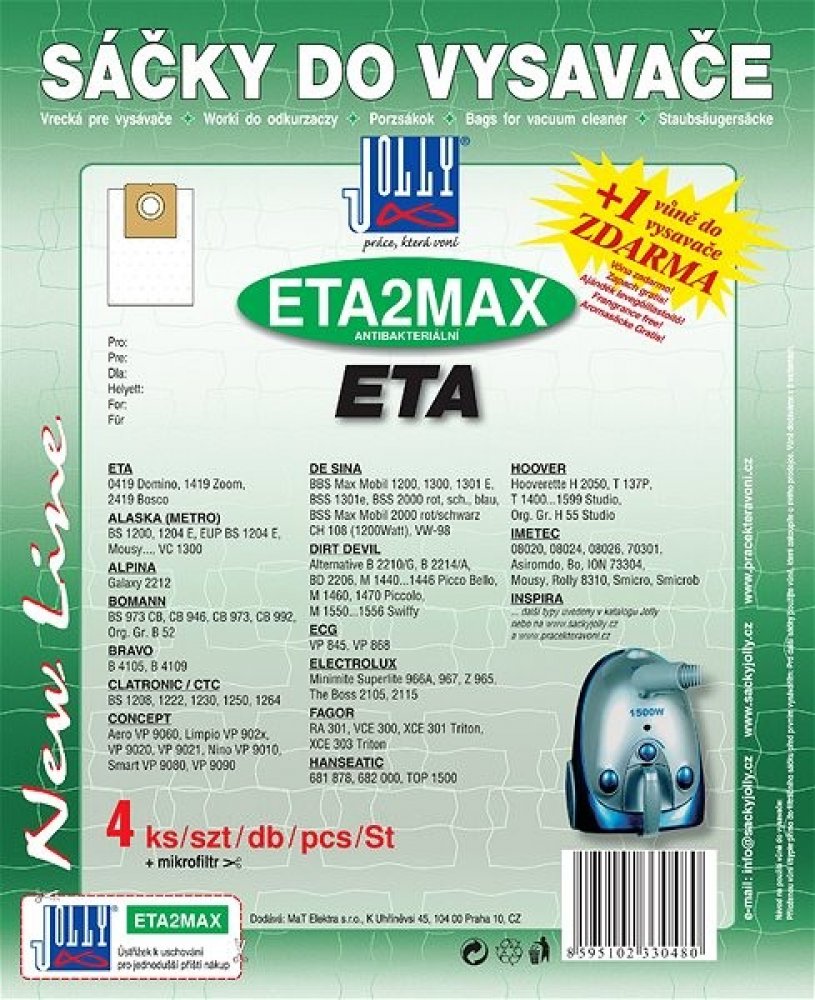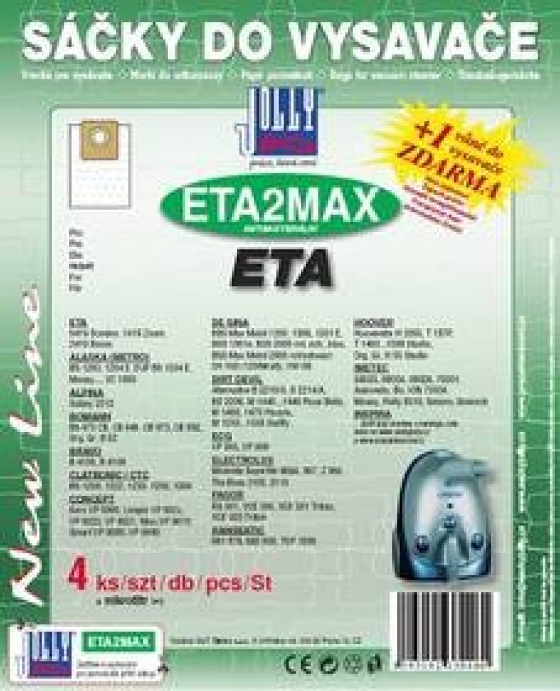 Sáčky ETA2 MAX Jolly textilní filtrační sáčky jsou vyrobeny z vícevrstvé netkané textílie v antibakteriálním provedení, které jsou vhodné pro sáčkový vysavač ETA Domino, Zoom, Bosco nebo SENCOR SVC 45 a SENCOR SVC 52 a pro další vysavače jiných výrobců BRAVO, CLATRONIC, CONCEPT, GORENJE, HYUNDAI...