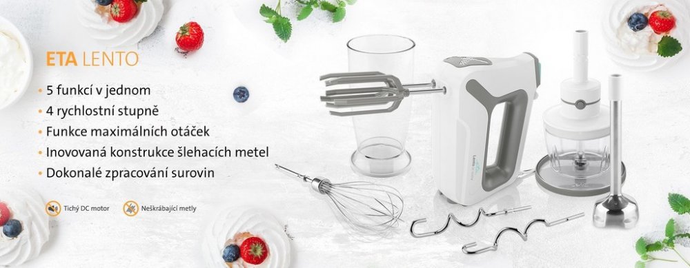 Výkonný DC motor s příkonem 600 W umožňuje optimální využití 4 rychlostních stupňů a disponuje funkcí maximálních otáček. Provoz šlehače je velmi tichý i díky inovované konstrukci šlehacích metel, které vždy zajistí dokonalé zpracování surovin a současně nepoškozují povrch nádoby. Po skončení šlehání snadno uvolníte metly nebo háky pomocí tlačítka. Při práci se nemusíte obávat přetížení, šlehač Lento je vybaven bezpečnostní pojistkou proti přehřátí.