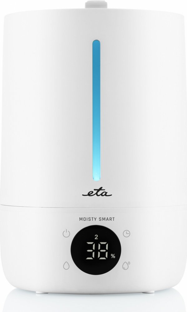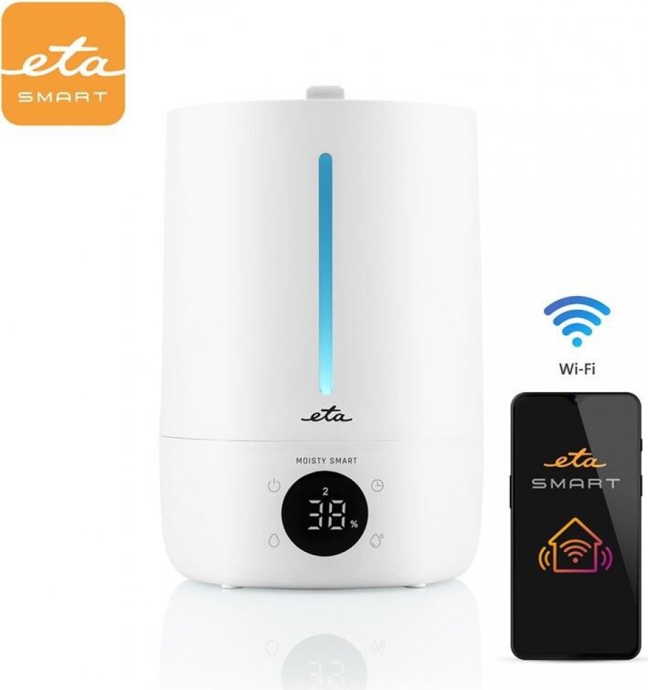 Ultrazvukový zvlhčovač vzduchu a aromadifusér 2v1 Ultrazvuková technologie rozprašování zabezpečuje efektivní zvlhčování a velmi tichý provoz Určeno pro běžné místnosti v domácnosti do rozlohy 40 m2 Vonné aroma oleje je možné aplikovat přímo do zásobníku s vodou Nastavitelná hodnota relativní vlhkosti v rozsahu od 30 do 75 % (po 5 %) Odnímatelná nádoba o objemu 5 l umožňuje snadné plnění shora Zvlhčovací výkon max. 300 ml/h Maximální objem nádoby zajistí až 30 hodin nepřetržitého provozu Přehledný LED displej Praktický časovač s možností nastavení doby provozu od 1 do 12 hodin 3 úrovně nastavení množství vodní páry pro optimální zvlhčování Možnost efektního podsvícení se 7 barvami. Lze nastavit i jen jednu oblíbenou barvu. Bezpečnostní automatické vypnutí při nedostatku vody v nádobě Světelná a zvuková signalizace provozu Protiskluzové nožky zajišťující stabilitu na pracovní ploše Délka napájecího kabelu 1,5 m Příkon 25 W Kompatibilní s Wi-Fi sítěmi o frekvenci 2,4 GHz Smart Aplikace ETA SMART umožňuje vzdálené ovládání zvlhčovače (např.