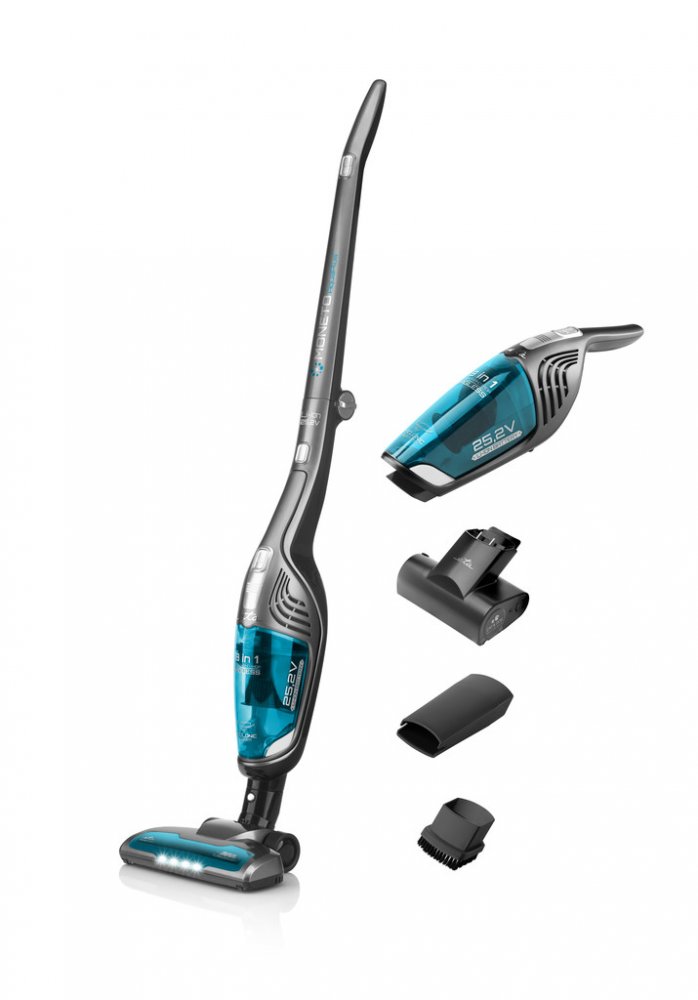 Tyčový vysavač s akumulátorem 25,2 V poskytuje až 50 minut provozu na jedno nabití a systém cyklónového vysávání zvyšuje jeho účinnost. Funkce mopování navíc zkracuje dobu úklidu.