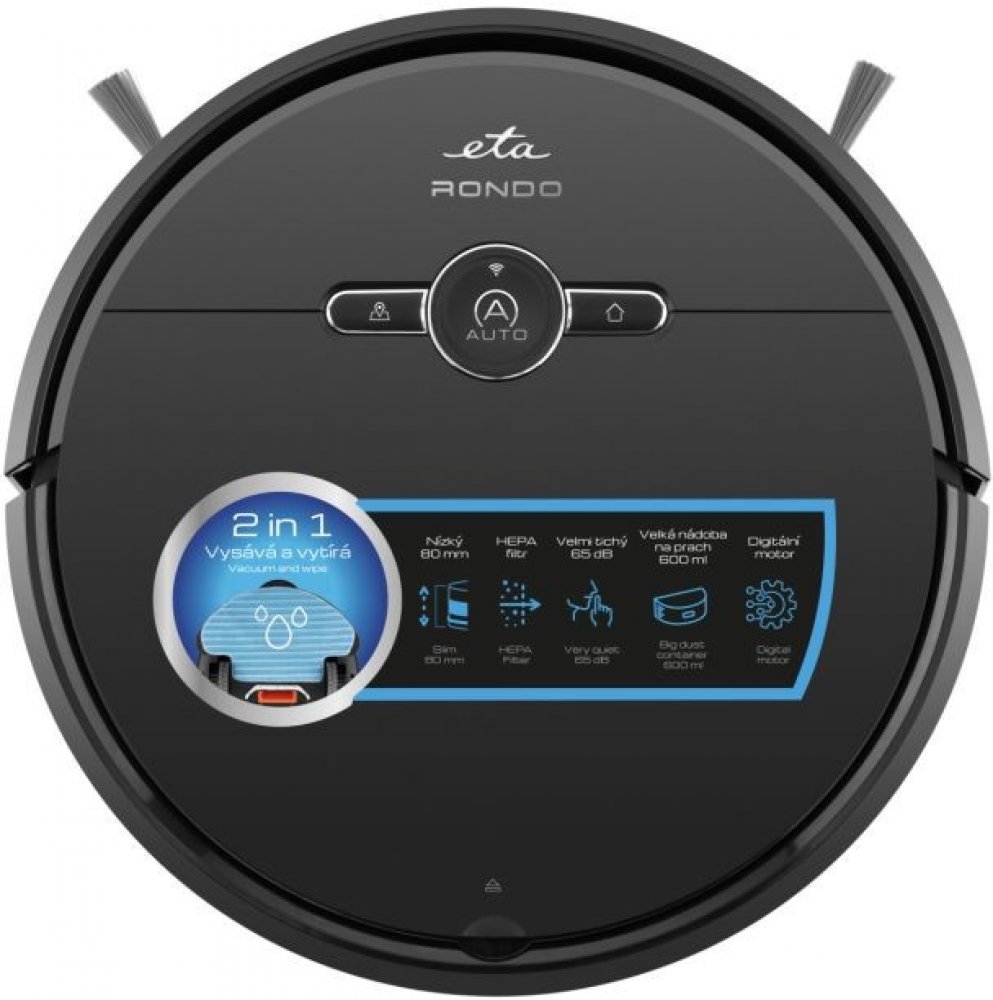 Robotický vysavač ETA Rondo kromě funkce vysávání disponuje i funkcí mopování, díky níž celou vaši domácnost efektivně vytře. Po dokončení úklidu nebo v případě docházející baterie se sám dopraví zpět do nabíjecí stanice. Nabíjení pak probíhá cca 5-6 hodin.