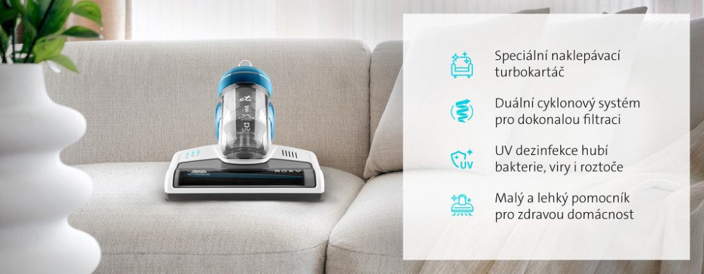 Zajistěte si dokonalou čistotu matrací, lůžkovin, postelí, čalouněného nábytku, sedacích souprav a autosedaček. Antibakteriální ruční vysavač ETA Roxy je vybavený speciální UV dezinfekcí. Díky UV světlu zničí až 99,9 % alergenů, bakterií, virů a roztočů. Zamezí tím jejich šíření. Perfektně se tedy hodí do domácnosti s alergiky a astmatiky.