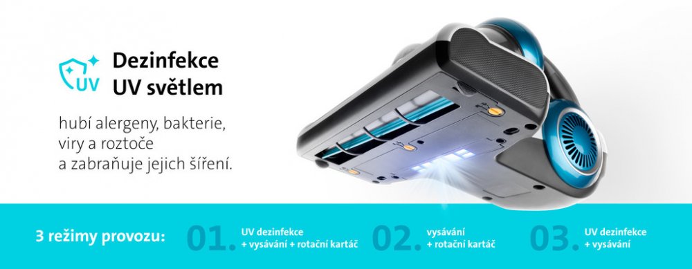 Ruční vysavač vám poskytne výběr ze 3 režimů provozu – UV dezinfekce + vysávání + rotační kartáč, vysávání + rotační kartáč nebo UV dezinfekce + vysávání. Má nízkou hmotnost a malé rozměry, takže se vám s ním pohodlně zachází. Světelná signalizace vás informuje o chodu vysavače.