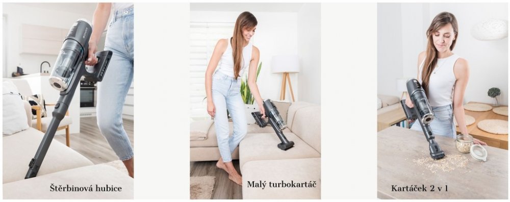 Jedním cvaknutím proměníte tyčový vysavač na praktickou ruční jednotku. Tu využijete při rychlém úklidu po dětech a usnadní vám i úklid interiéru auta.